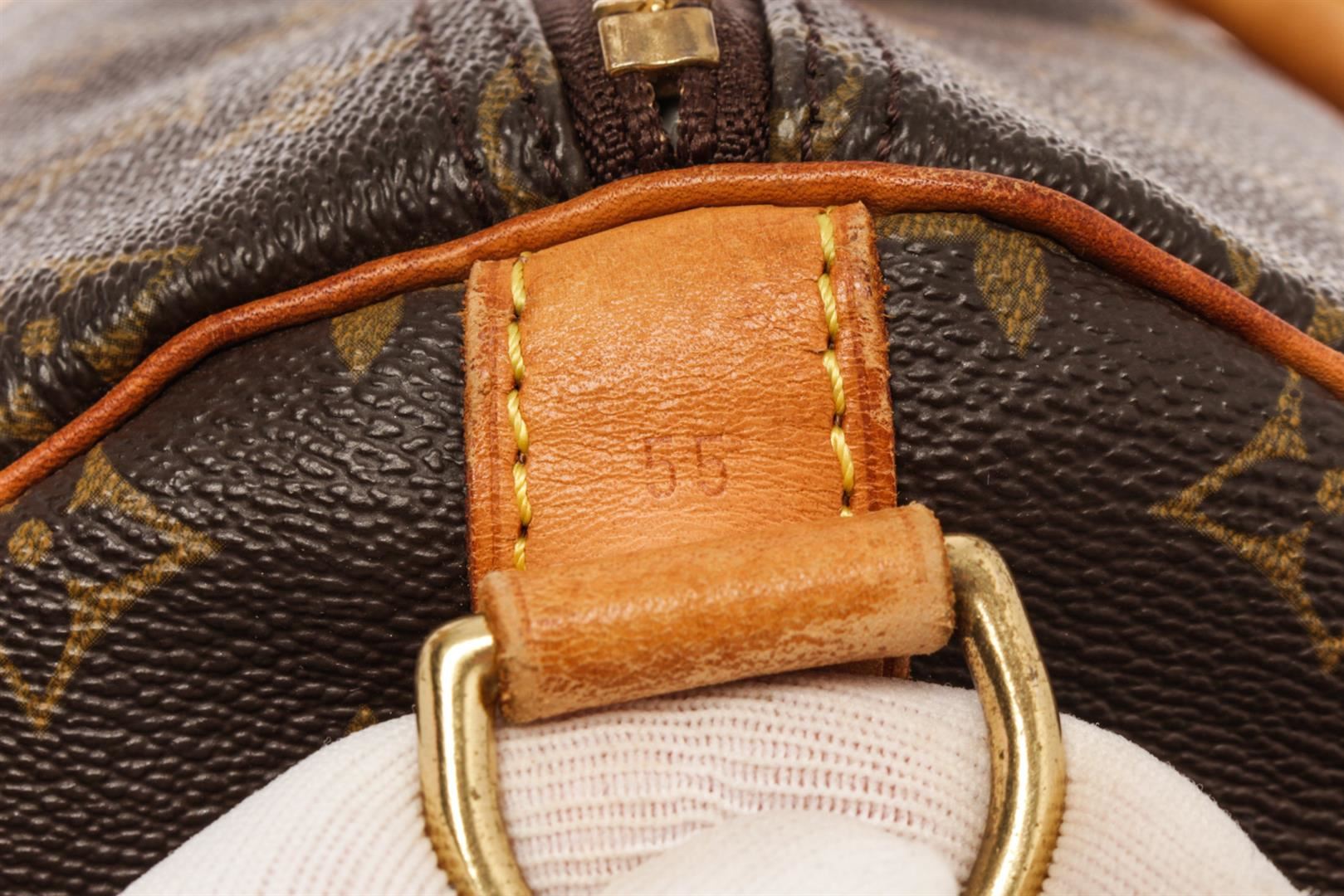 Louis Vuitton Brown Monogram Canvas Bandoulière Keepall 55 Travel Bag. All available information is listed in the description and shown in the photos. Louis Vuitton brown monogram coated canvas Keepall Bandoulière 55 travel bag with gold-tone hardware, brown fabric interior, contrasting vachetta leather top handles and trims, and a top zipper closure. Height: 12.2" Width: 9.4" Depth: 21.7, 30.99 x 23.88 x 55.12 Cm