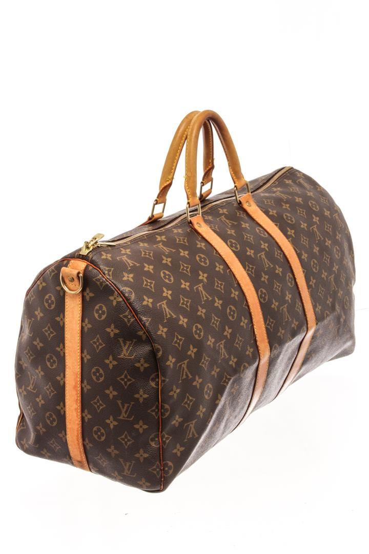 Louis Vuitton Brown Monogram Canvas Bandoulière Keepall 55 Travel Bag. All available information is listed in the description and shown in the photos. Louis Vuitton brown monogram coated canvas Keepall Bandoulière 55 travel bag with gold-tone hardware, brown fabric interior, contrasting vachetta leather top handles and trims, and a top zipper closure. Height: 12.2" Width: 9.4" Depth: 21.7, 30.99 x 23.88 x 55.12 Cm