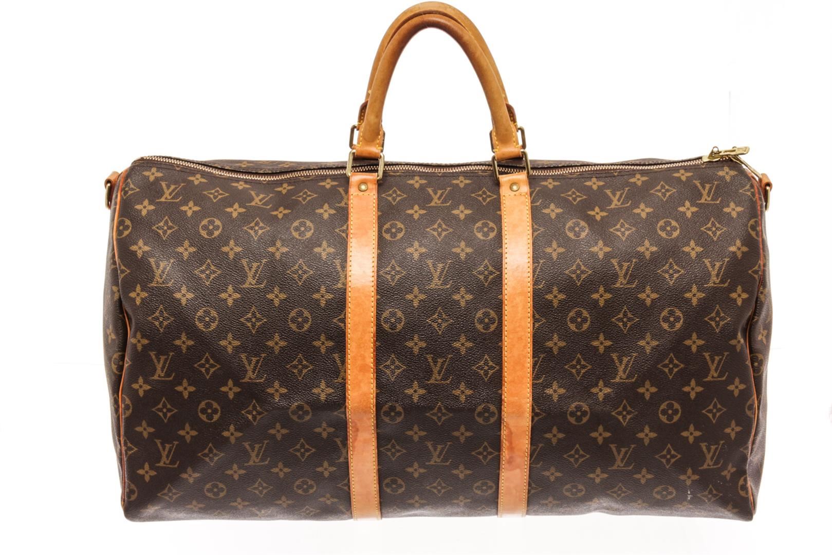 Louis Vuitton Brown Monogram Canvas Bandoulière Keepall 55 Travel Bag. All available information is listed in the description and shown in the photos. Louis Vuitton brown monogram coated canvas Keepall Bandoulière 55 travel bag with gold-tone hardware, brown fabric interior, contrasting vachetta leather top handles and trims, and a top zipper closure. Height: 12.2" Width: 9.4" Depth: 21.7, 30.99 x 23.88 x 55.12 Cm