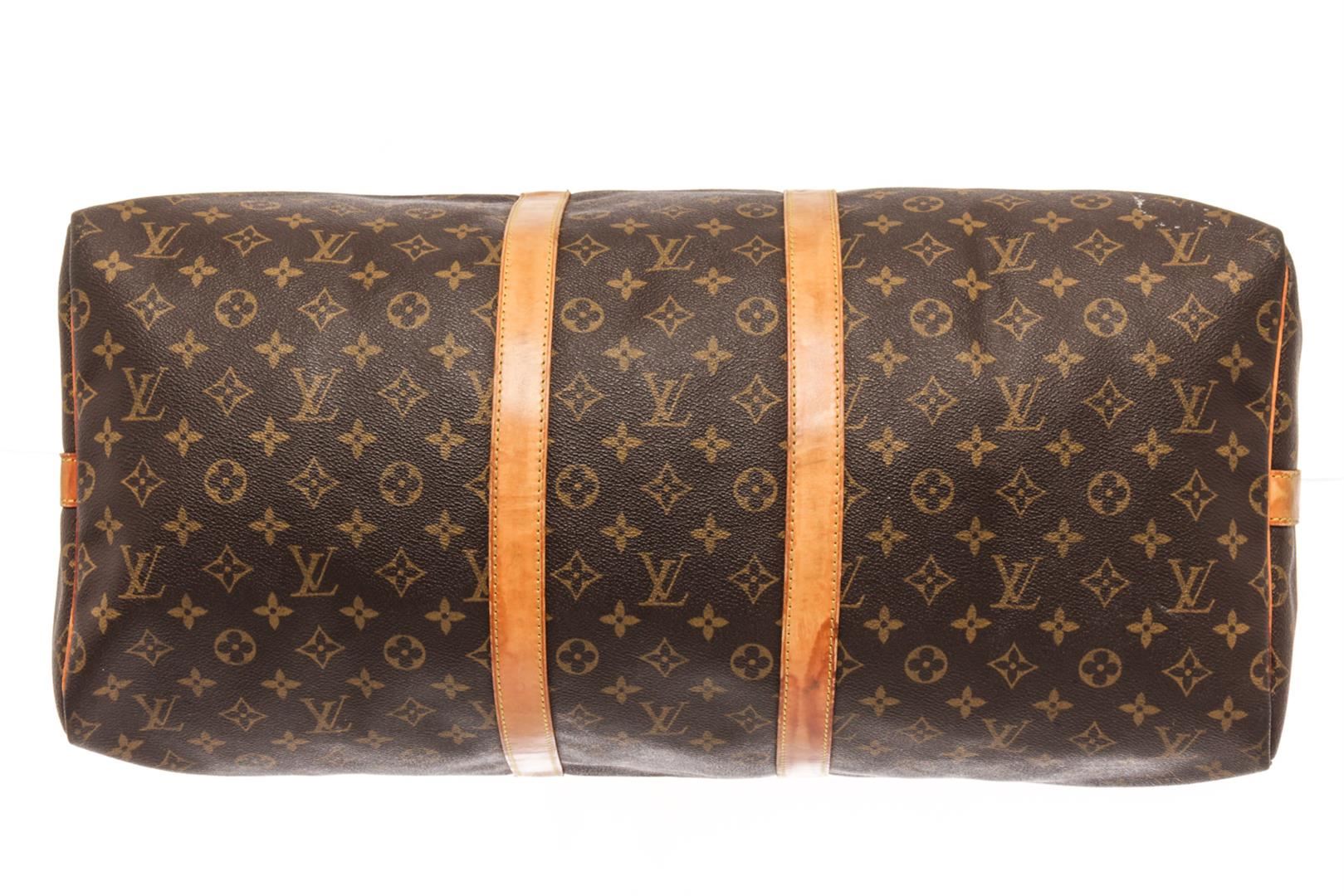 Louis Vuitton Brown Monogram Canvas Bandoulière Keepall 55 Travel Bag. All available information is listed in the description and shown in the photos. Louis Vuitton brown monogram coated canvas Keepall Bandoulière 55 travel bag with gold-tone hardware, brown fabric interior, contrasting vachetta leather top handles and trims, and a top zipper closure. Height: 12.2" Width: 9.4" Depth: 21.7, 30.99 x 23.88 x 55.12 Cm
