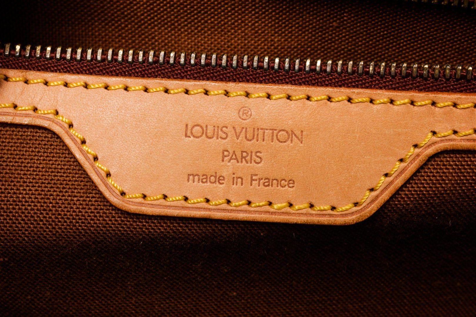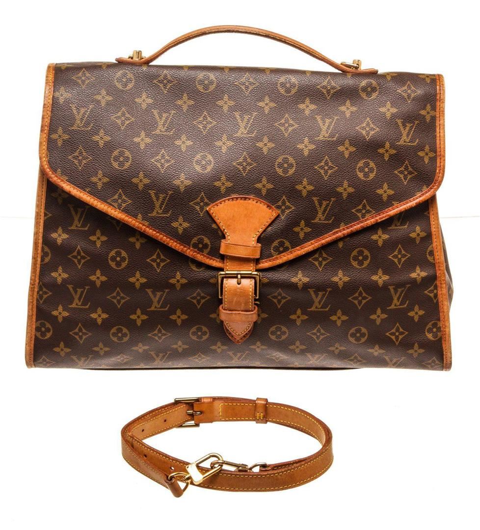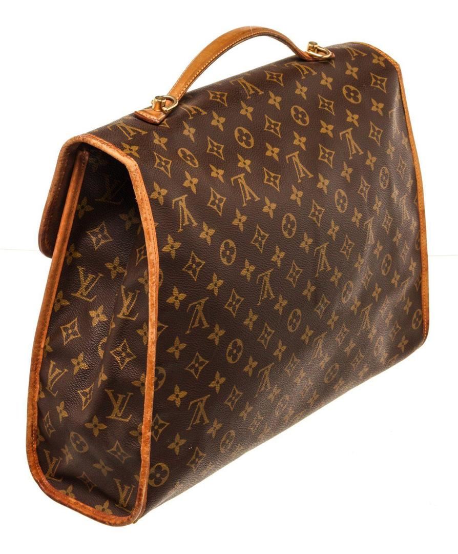 Louis Vuitton Brown Monogram Canvas Beverly Briedcase Bag with monogram canvas, brass hardware, tan vachetta leather trim, single flat top handle, brown canvas lining, single pocket at interior wall with zip closure and flap with buckle closure at front.