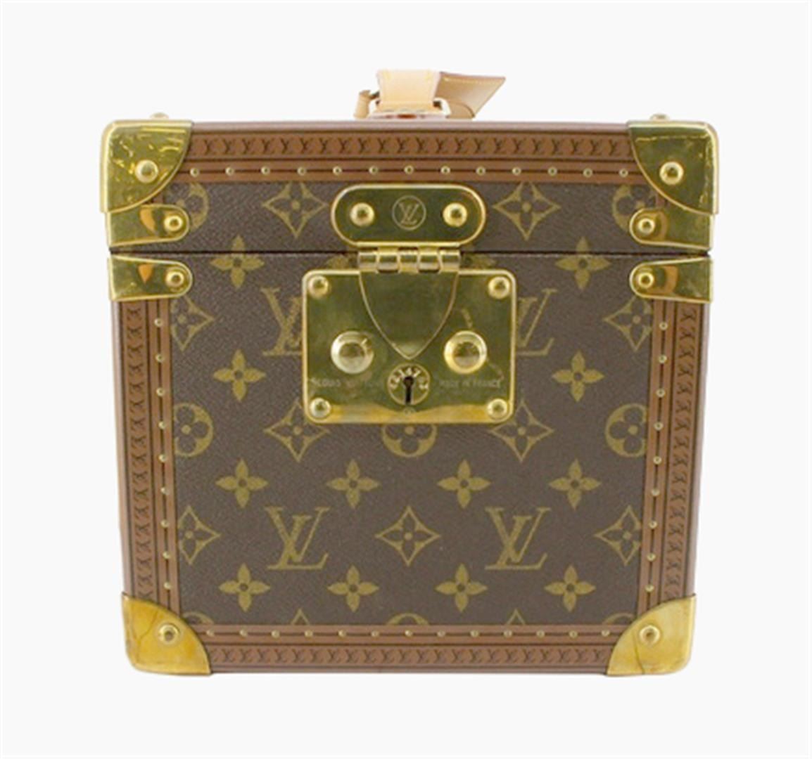 Brown and tan monogram coated canvas Louis Vuitton Boite Flacons Beauty Case with gold-tone hardware, brown leather and tan vachetta leather trim, single flat top handle, beige coated canvas lining, accompanying case with mirror at interior and dual flip-