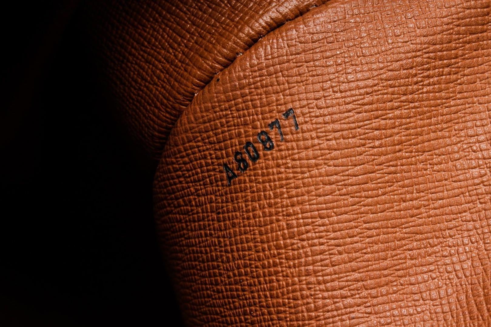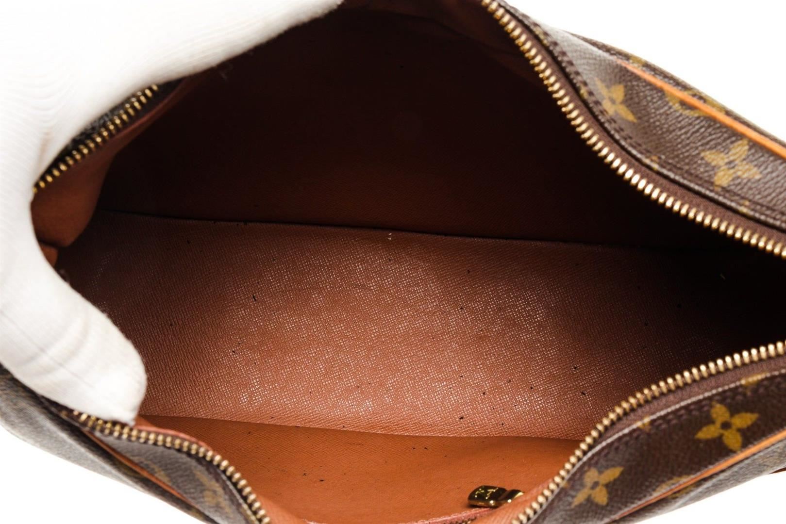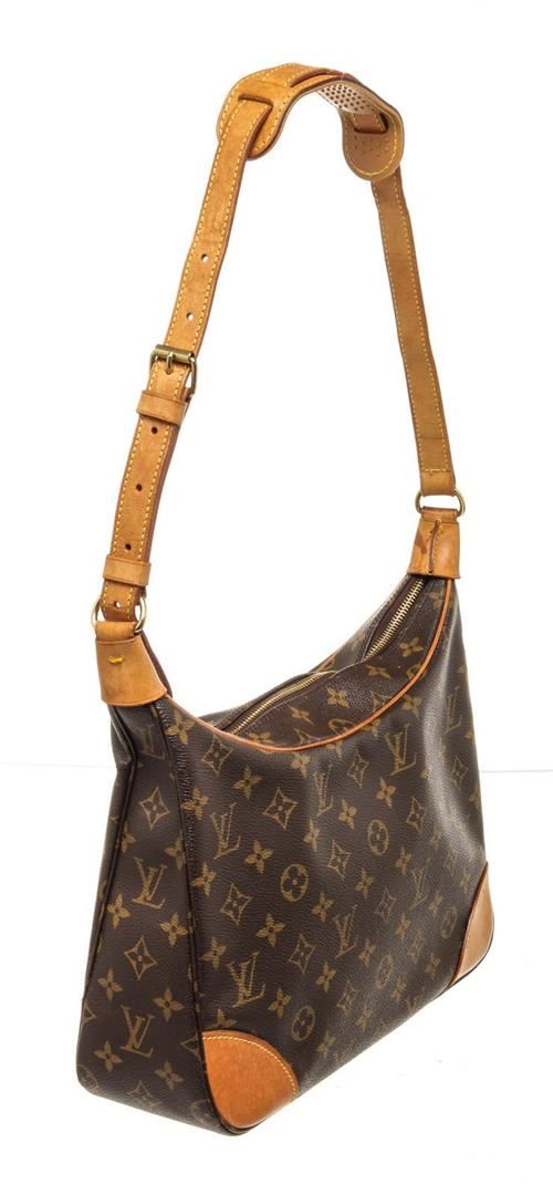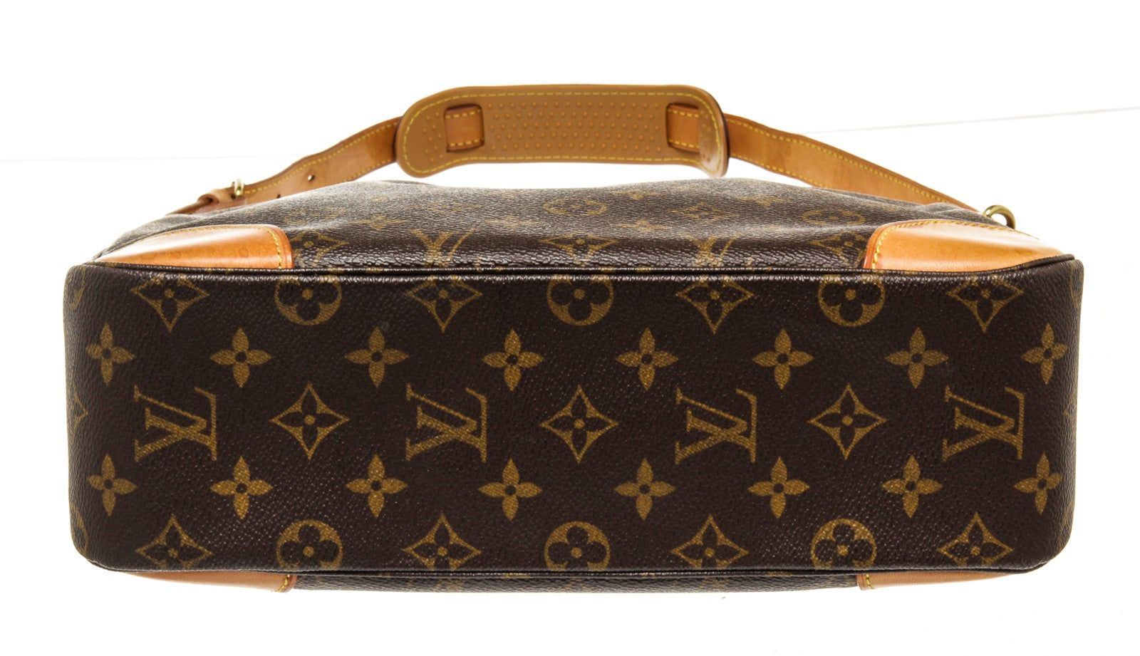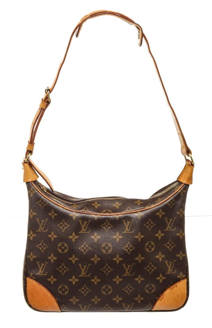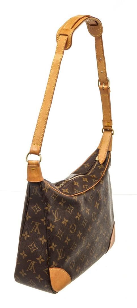 Louis Vuitton Brown Monogram Canvas Boulogne 30cm Bag with monogram canvas, brass hardware, tan vachetta leather accents throughout, single flat shoulder strap with buckle adjustment and shoulder guard, brown coated canvas interior lining, single pocket at interior wall with zip closure.