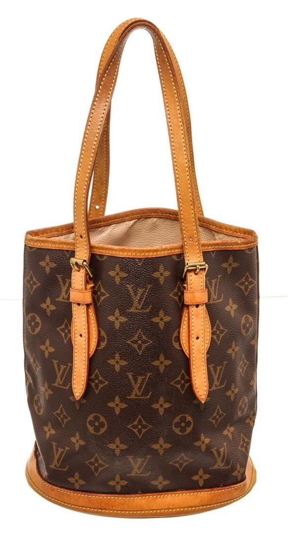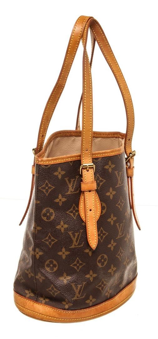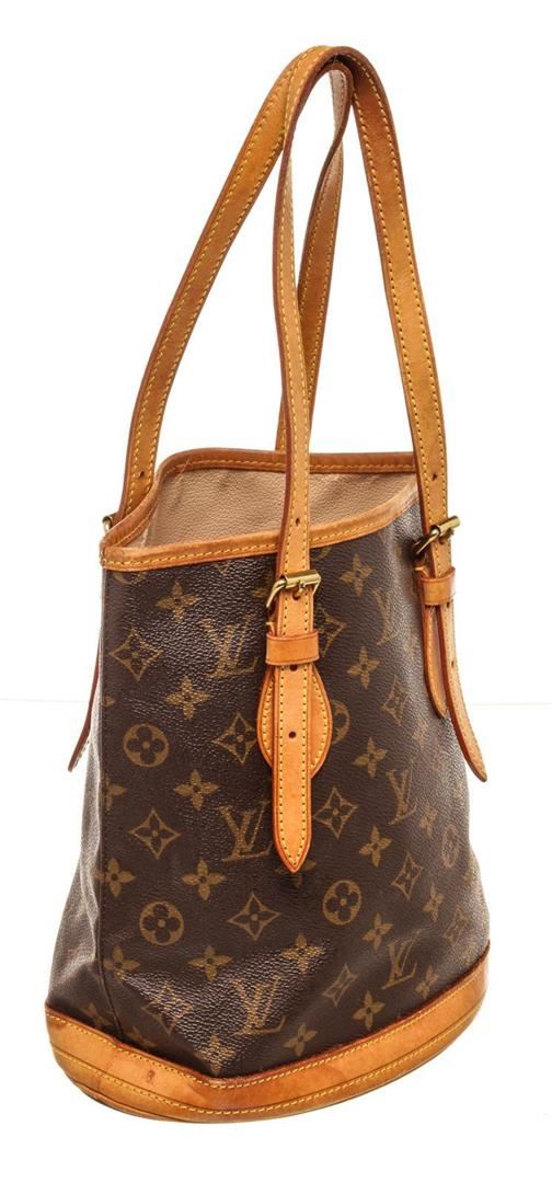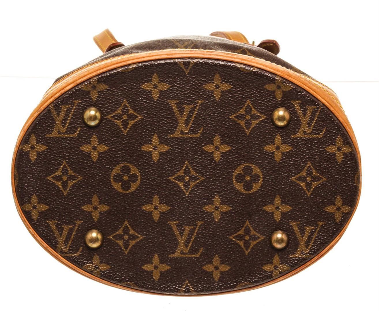 Louis Vuitton Brown Monogram Canvas Bucket PM Shoulder Bag with monogram canvas, gold-tone hardware, tan Vachetta leather trim, dual flat shoulder straps with buckle adjustments, canvas lining, zip closure.
