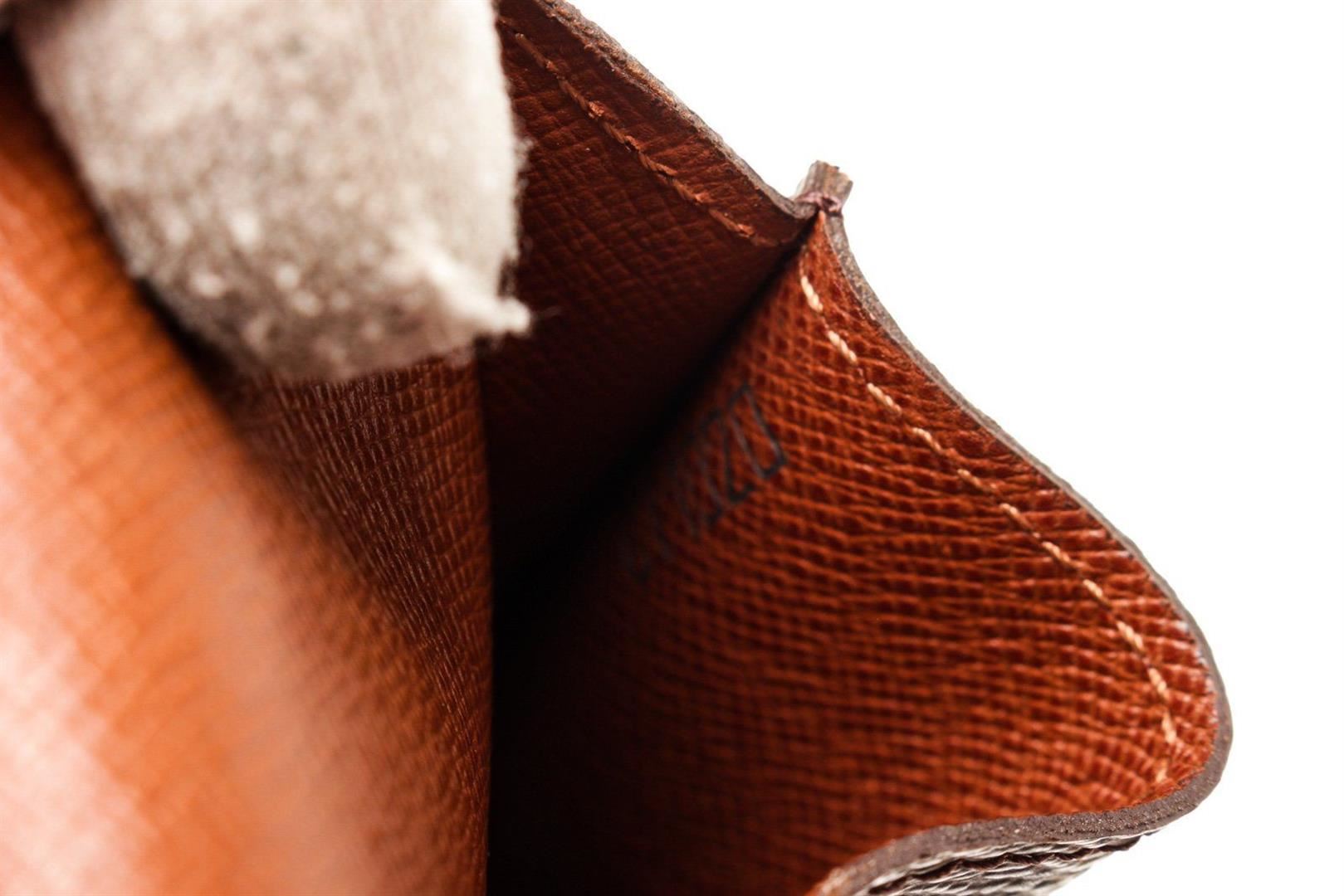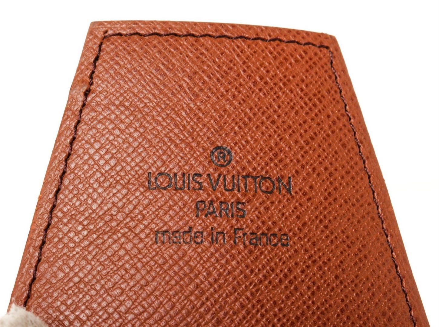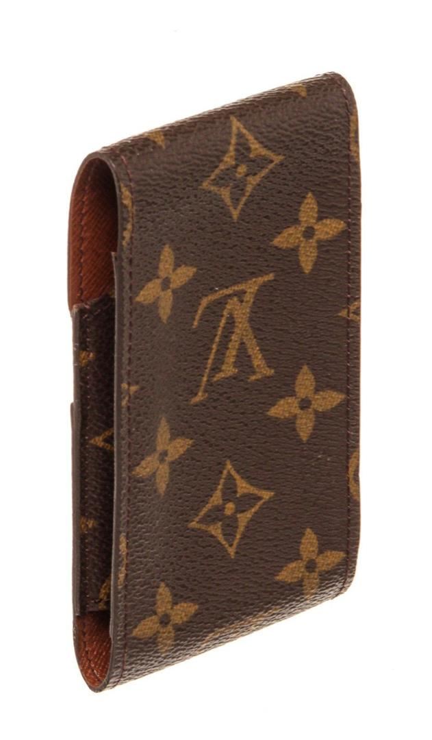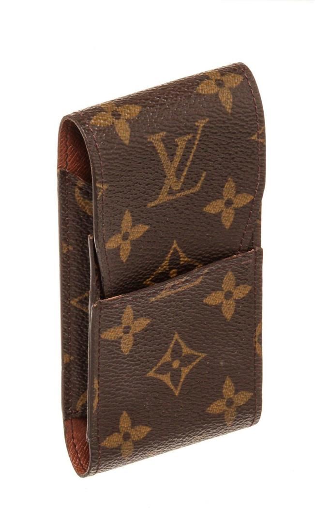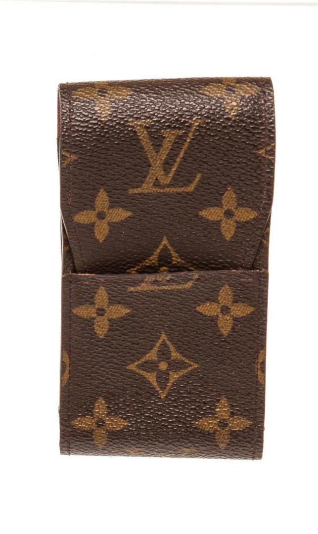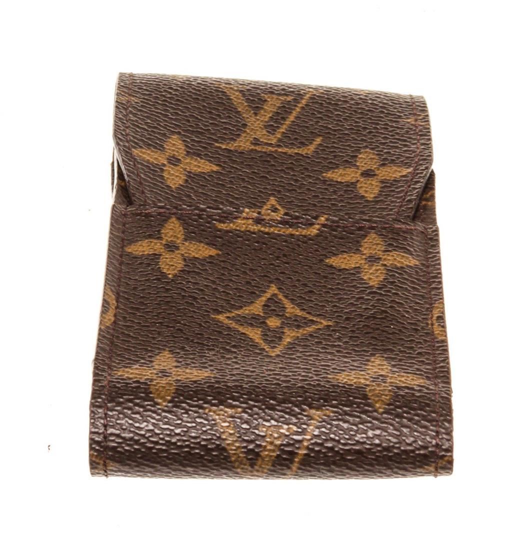 Louis Vuitton Brown Monogram Canvas Cigarette Case Clutch with monogram canvas, gold-tone hardware, trim tan vachetta leather, interior slip pocket and snap closure.