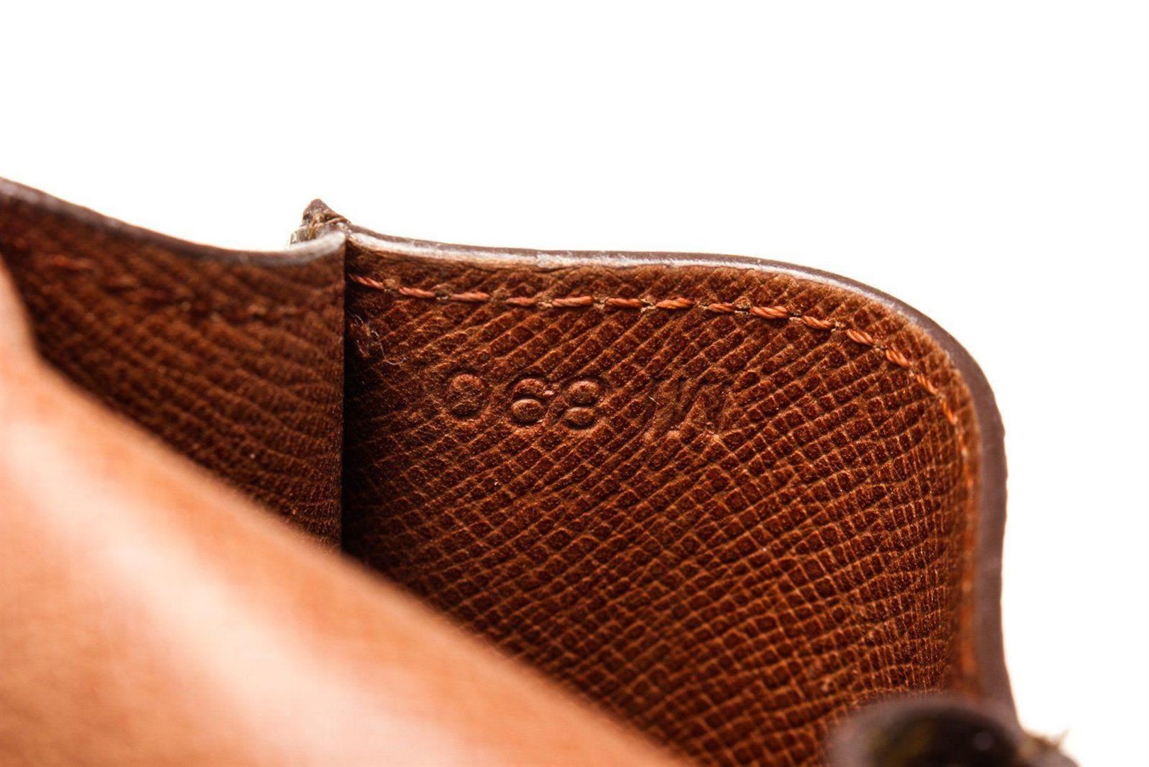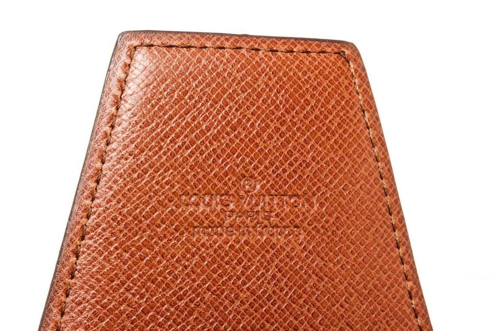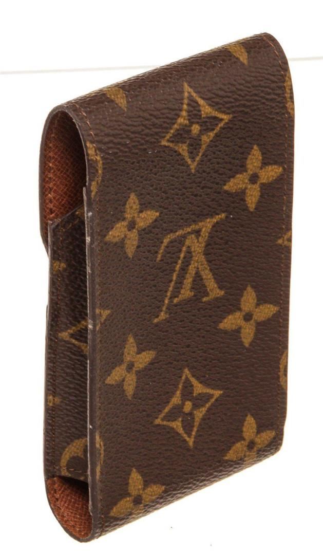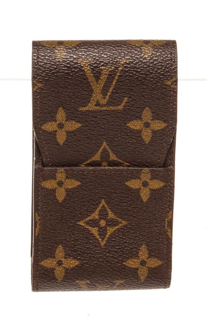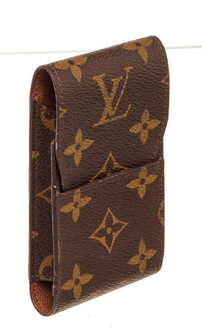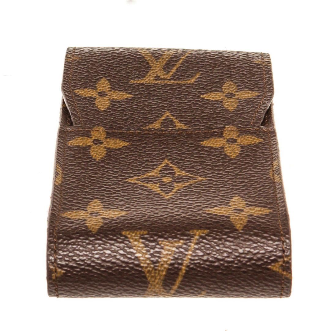Louis Vuitton Brown Monogram Canvas Cigarette Case Clutch with monogram canvas, gold-tone hardware, trim tan vachetta leather, interior slip pocket and snap closure.