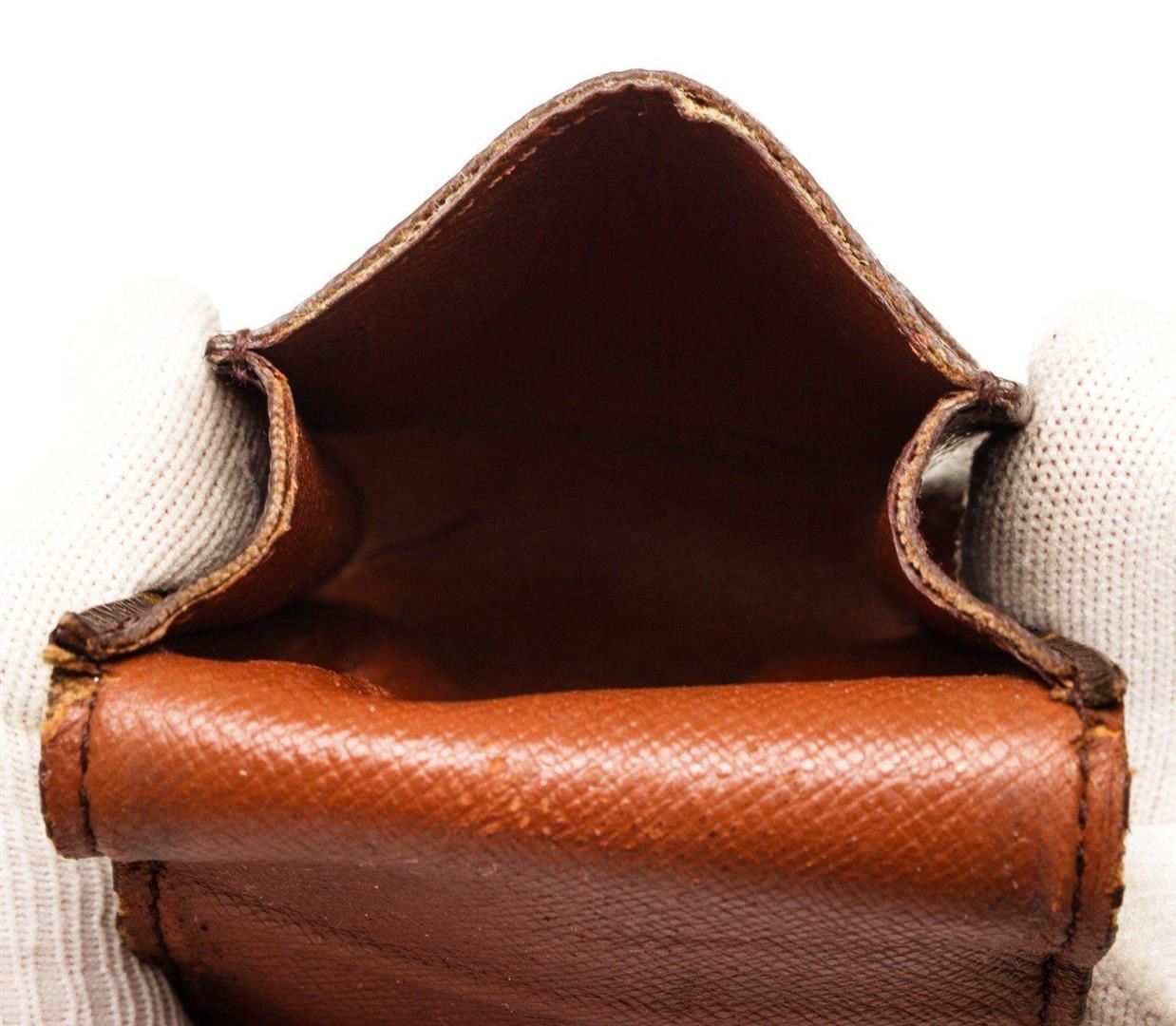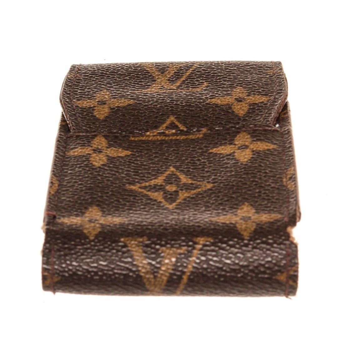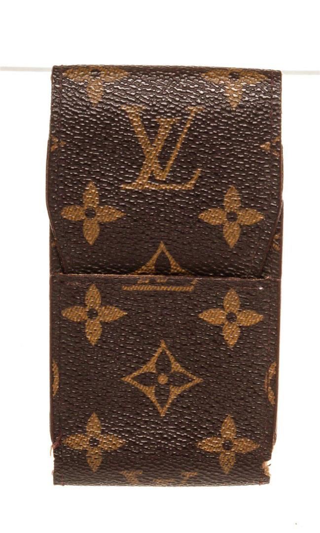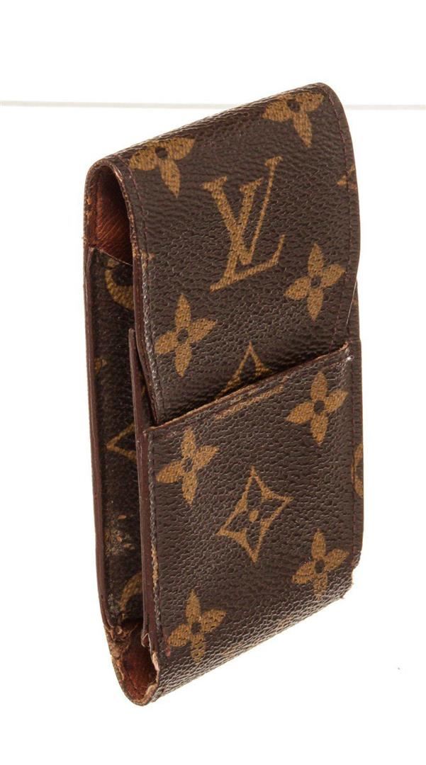 Louis Vuitton Brown Monogram Canvas Cigarette Case Clutch with material monogram canvas, gold-tone hardware, trim tan vachetta leather, interior slip pocket and snap closure.
