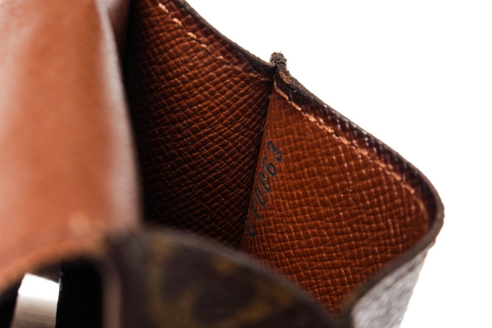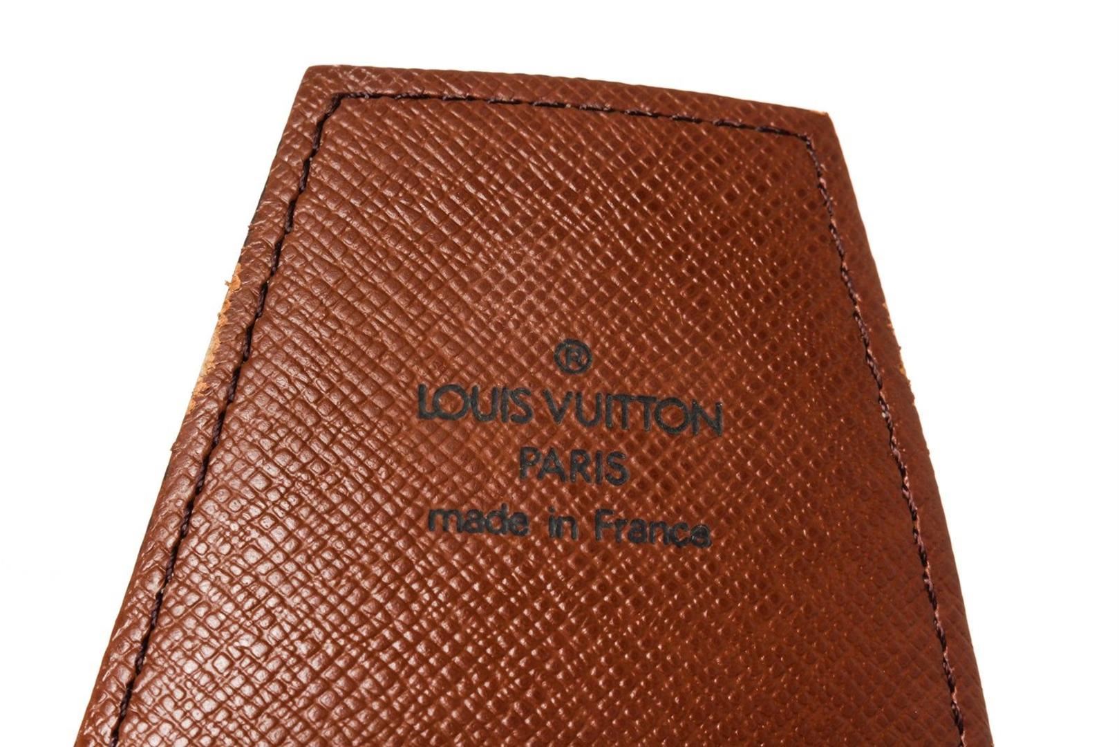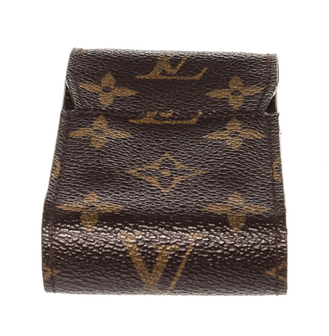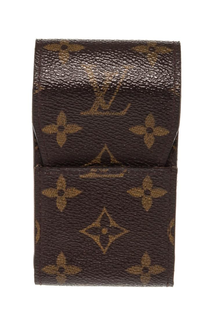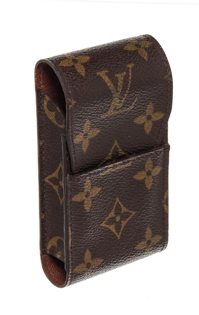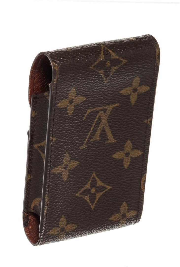 Louis Vuitton Brown Monogram Canvas Cigarette Case Clutch with monogram canvas, gold-tone hardware, trim tan vachetta leather, interior slip pocket and snap closure.