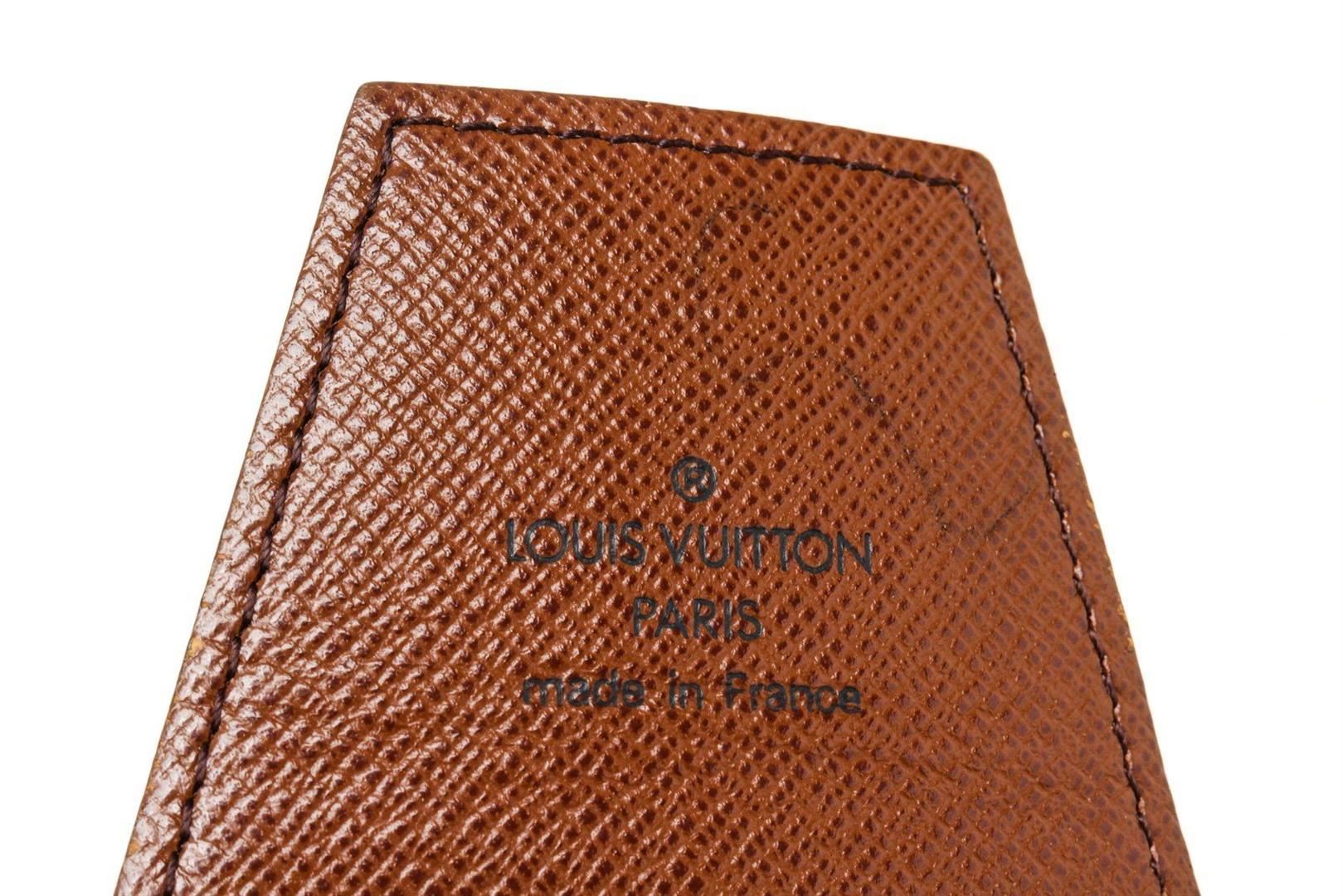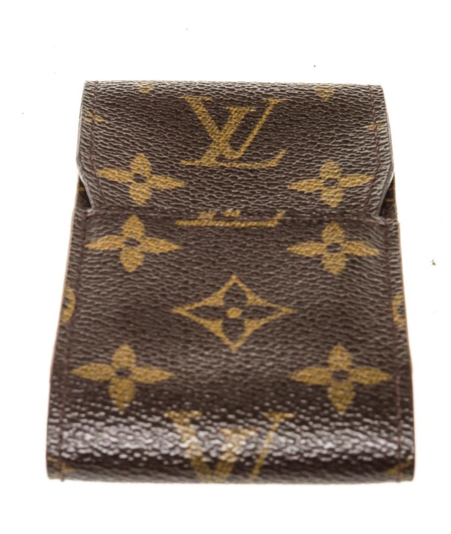 One Louis Vuitton Brown Monogram Canvas Cigarette Case. Item is sold AS-IS. All available information is listed in the description and shown in the photo. Louis Vuitton Brown Monogram Canvas Cigarette Case with monogram canvas, gold-tone hardware, trim tan vachetta leather, interior slip pocket and snap closure.