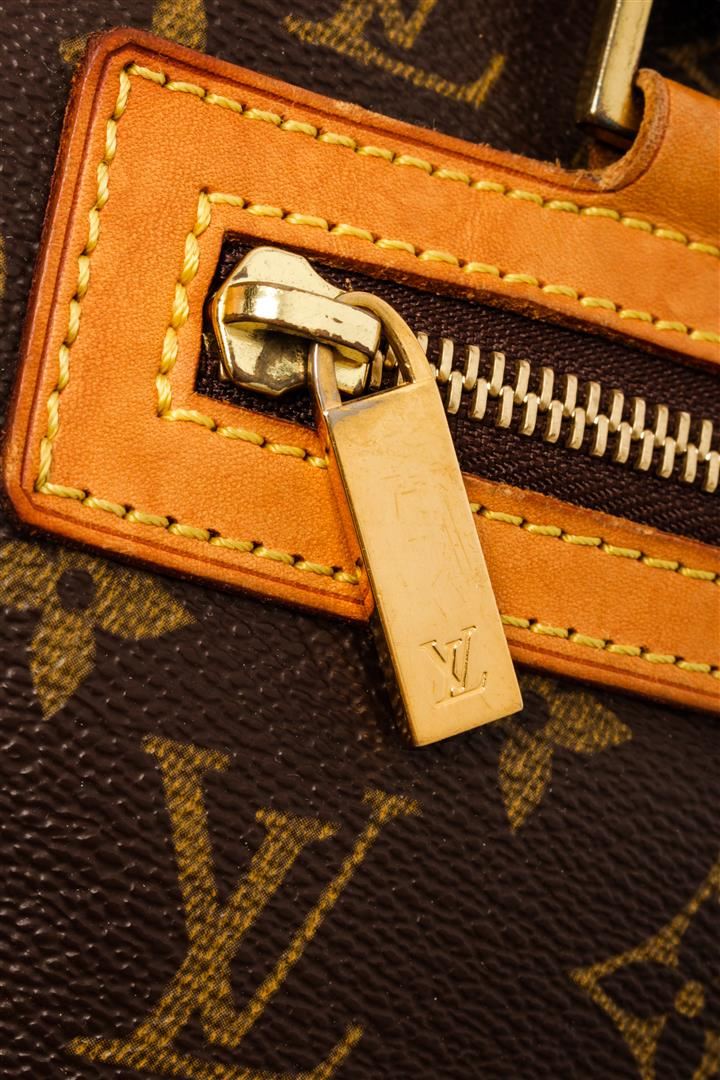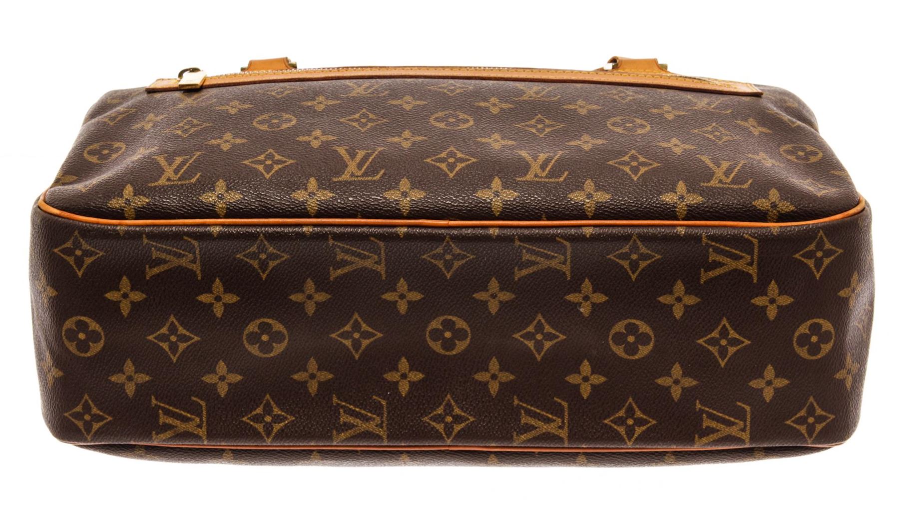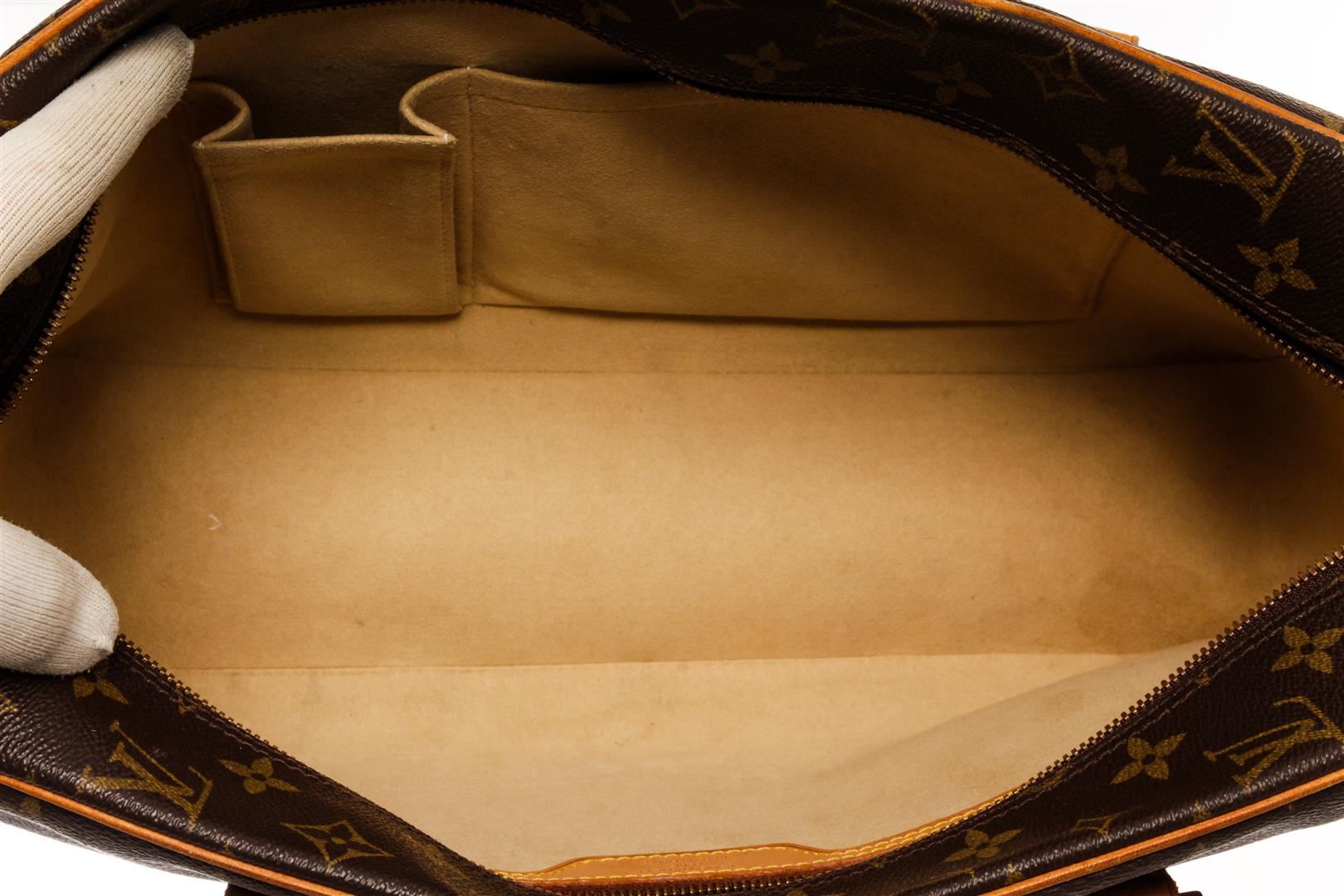 Louis Vuitton Brown Monogram Canvas Cite GM Shoulder Bag. All available information is listed in the description and shown in the photos. Louis Vuitton Brown Monogram Canvas Cite GM Shoulder Bag with brown coated canvas, brass hardware, dual shoulder straps, single exterior pocket, alcantara lining & dual interior pockets, zip closure at top. Height: 8.75" Width: 13.5" Depth: 3.75", Shoulder Strap Drop: 10.5" / 22.22 x 34.29 x 9.52 Cm