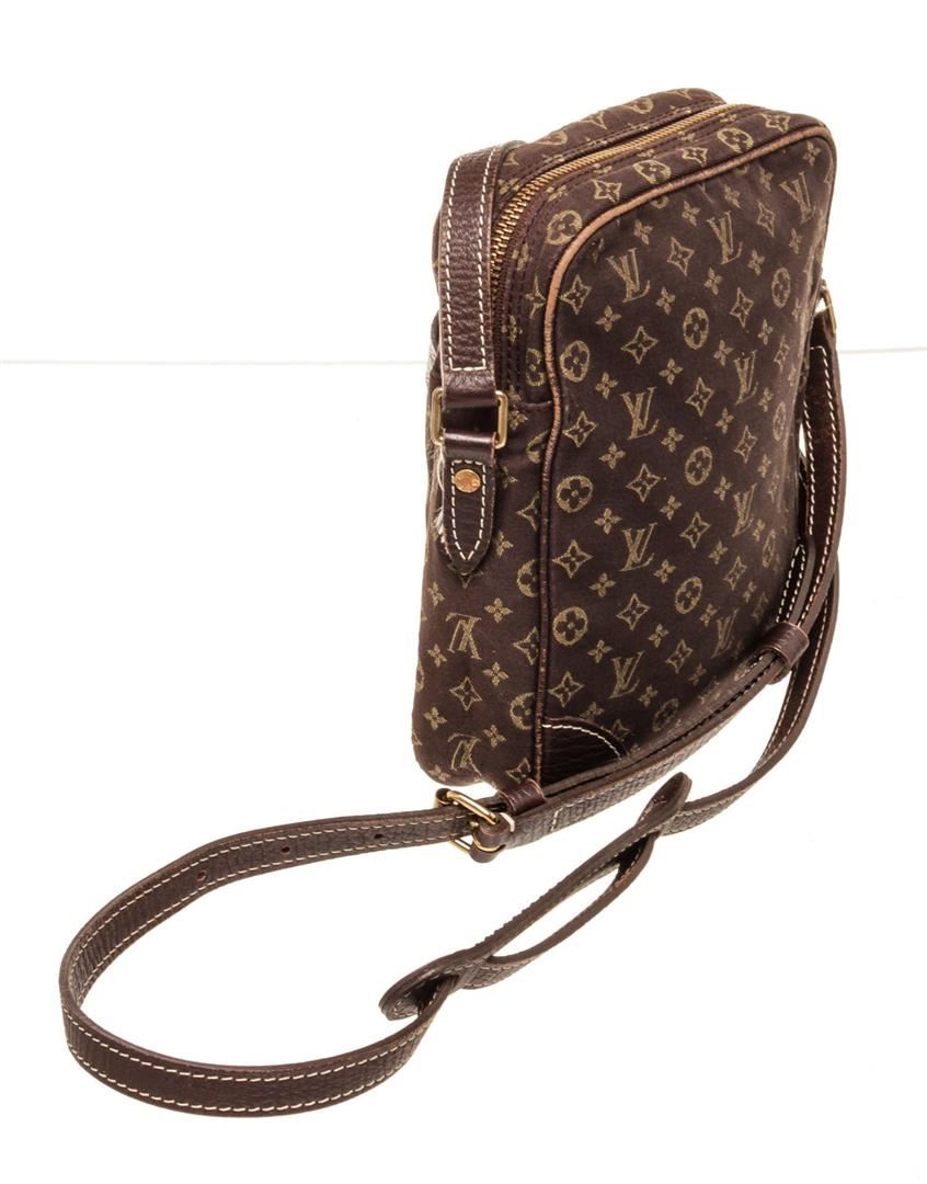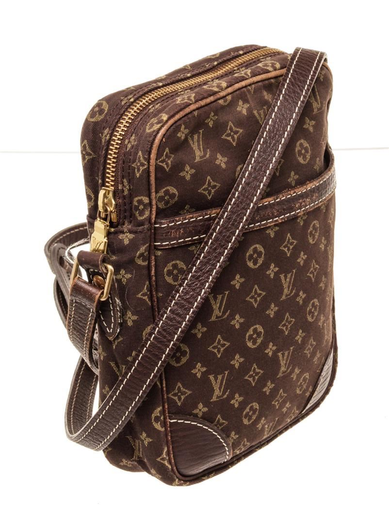 Louis Vuitton Brown Monogram Canvas Danube Crossbody Bag with monogram canvas, gold-tone hardware, trim tan vachetta leather, interior slip pocket, adjustable shoulder strap and zipper closure.