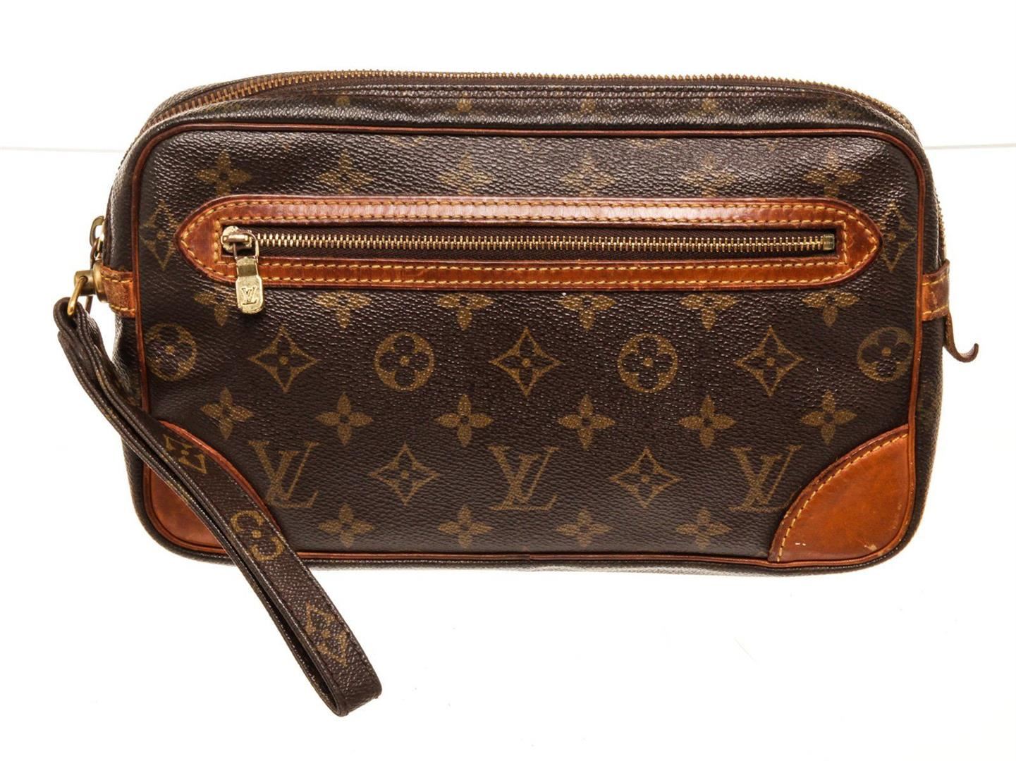 Louis Vuitton Brown Monogram Canvas Dragonne Clutch Bag with material monogram canvas, gold-tone hardware, trim tan vachetta leather, exterior zip pocket, interior zip pocket and zipper closure.