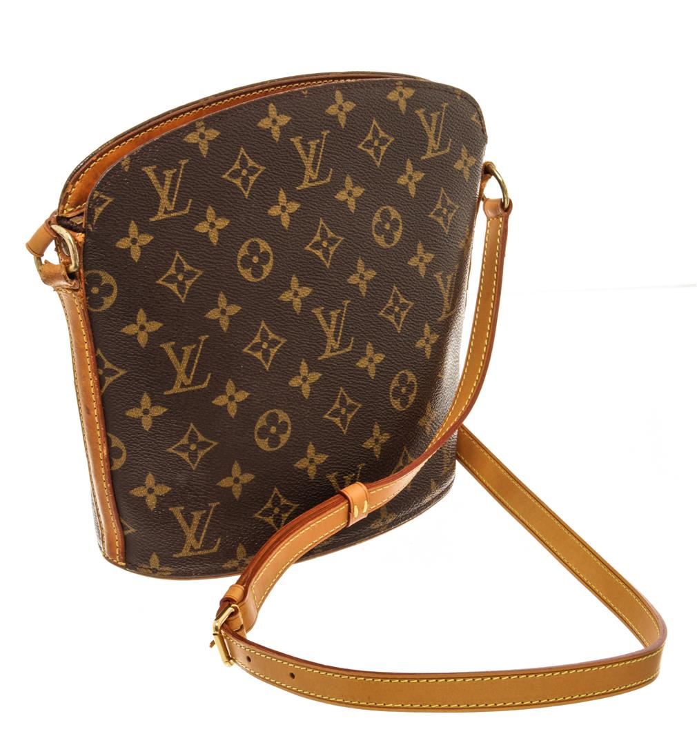 One Louis Vuitton Brown Monogram Canvas Drouot Shoulder Bag. Item is sold AS-IS. All available information is listed in the description and shown in the photo. louis vuitton brown monogram canvas drouot shoulder bag with gold-tone hardware, full lining, internal logo stamp, adjustable shoulder strap, zip closure. Depth 10 cm, Height 22 cm, Width 24 cm / 3.93" x 8.66" x 9.44" Inches