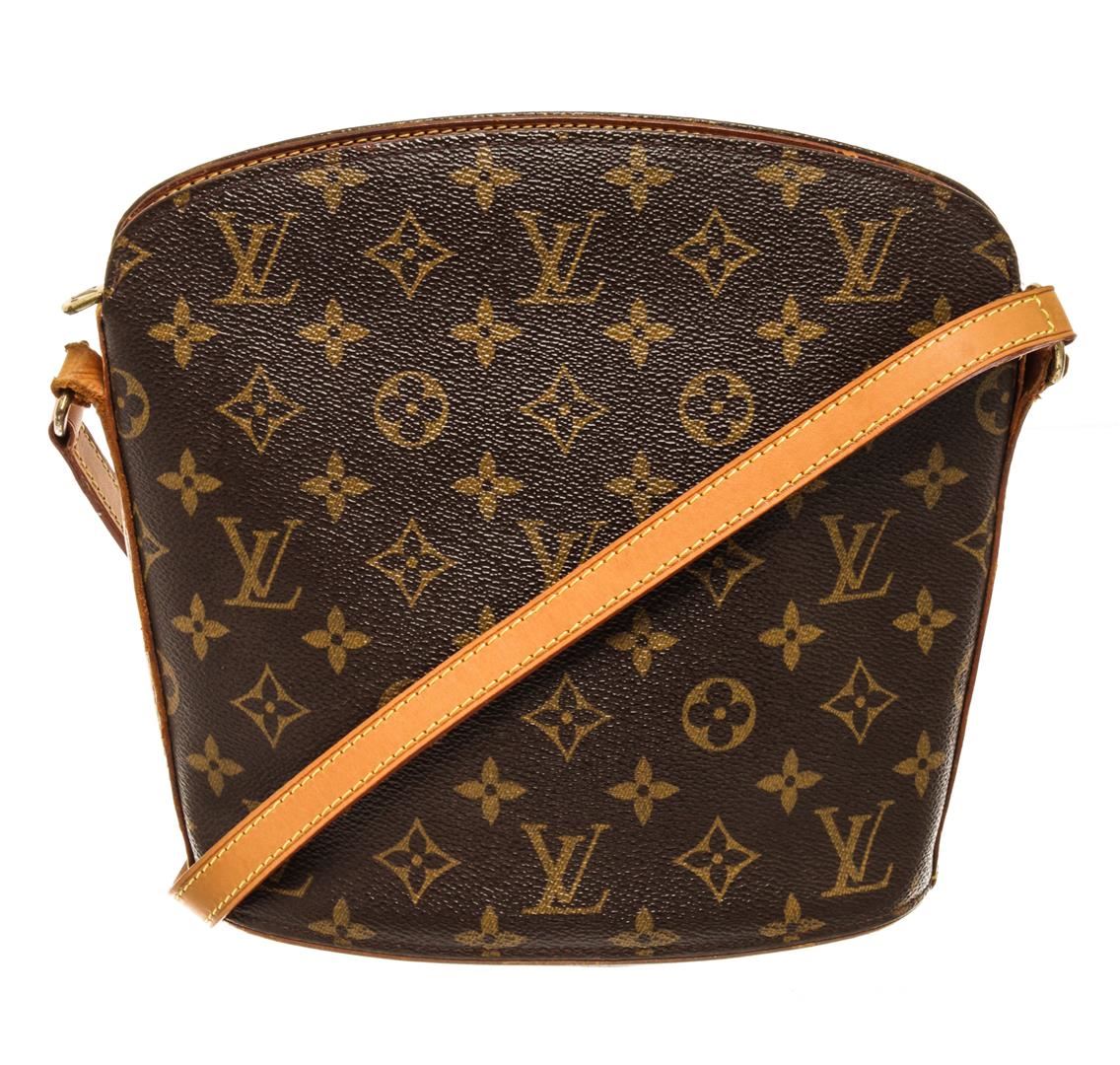 One Louis Vuitton Brown Monogram Canvas Drouot Shoulder Bag. Item is sold AS-IS. All available information is listed in the description and shown in the photo. louis vuitton brown monogram canvas drouot shoulder bag with gold-tone hardware, full lining, internal logo stamp, adjustable shoulder strap, zip closure. Depth 10 cm, Height 22 cm, Width 24 cm / 3.93" x 8.66" x 9.44" Inches