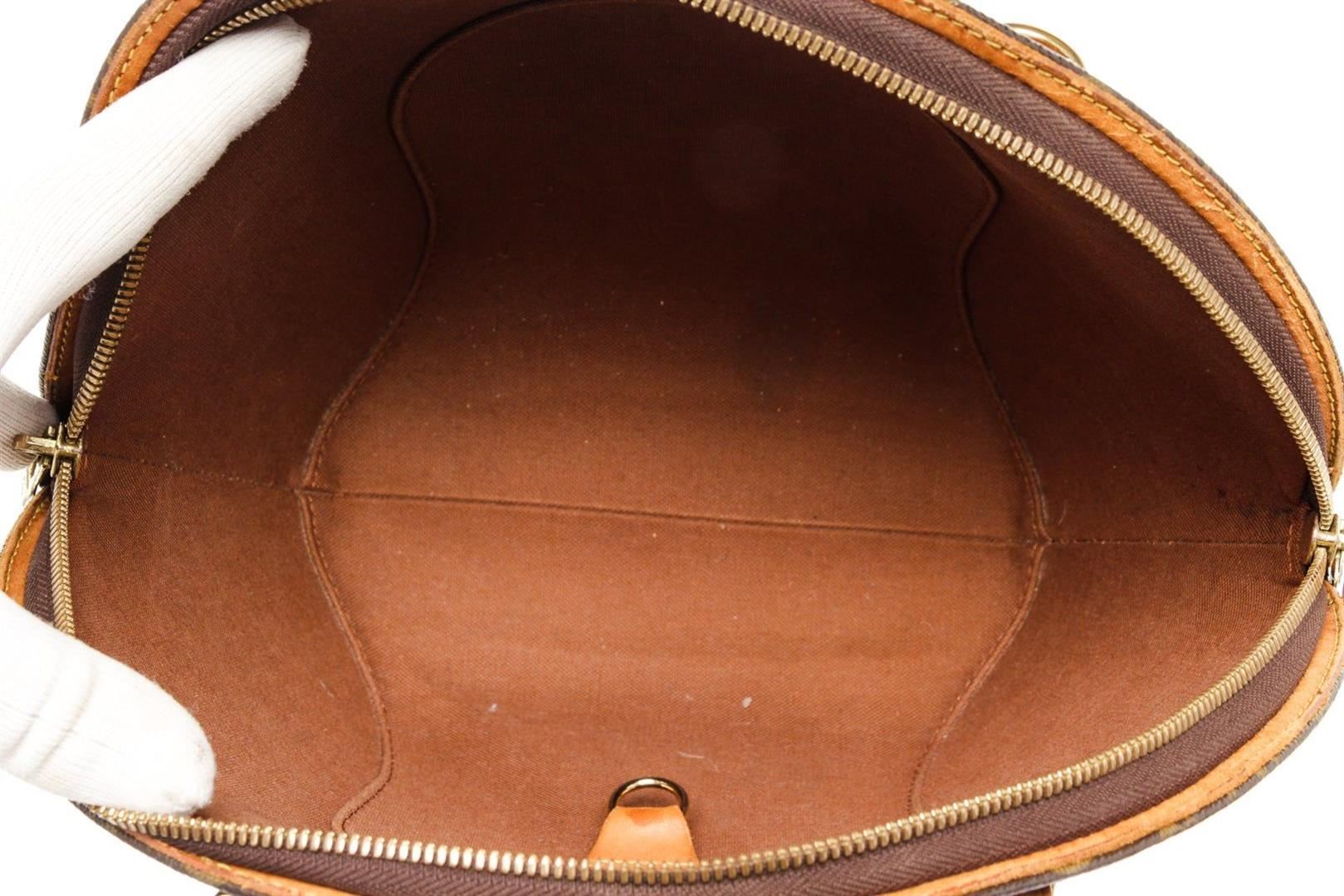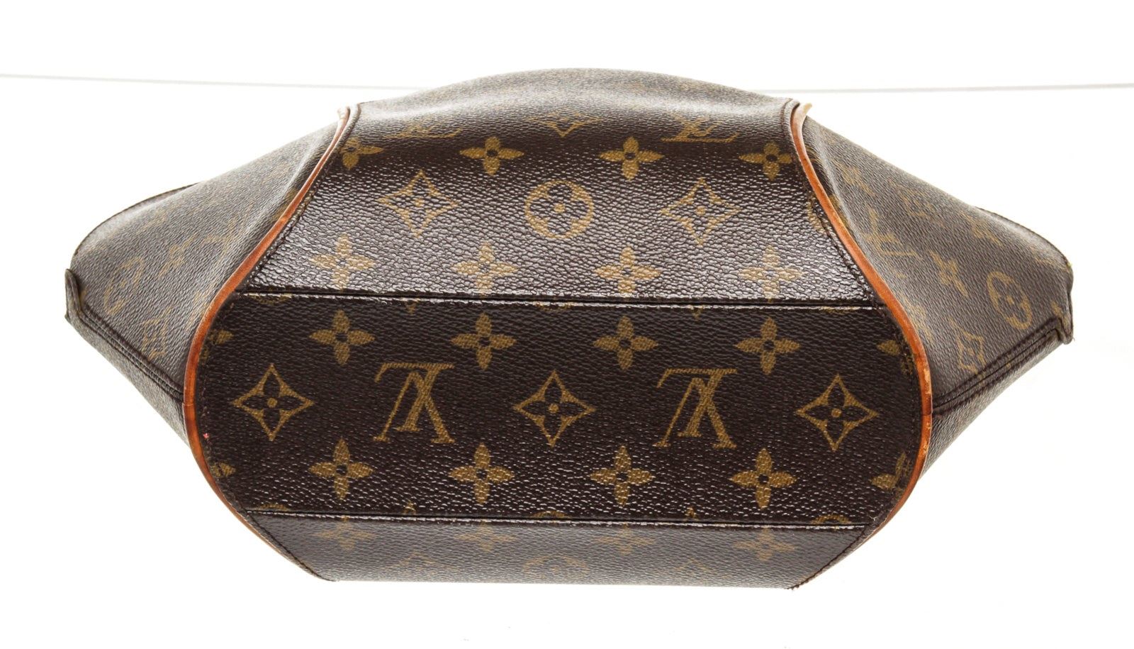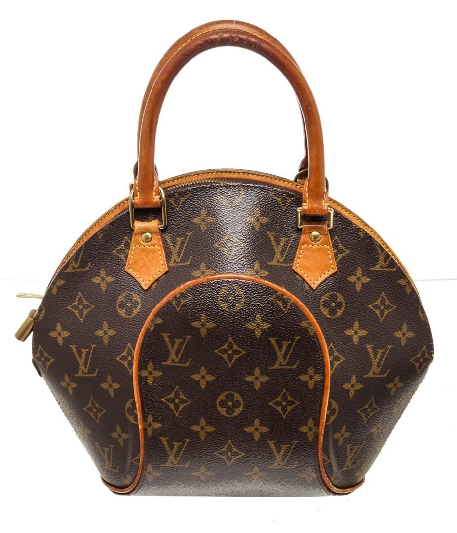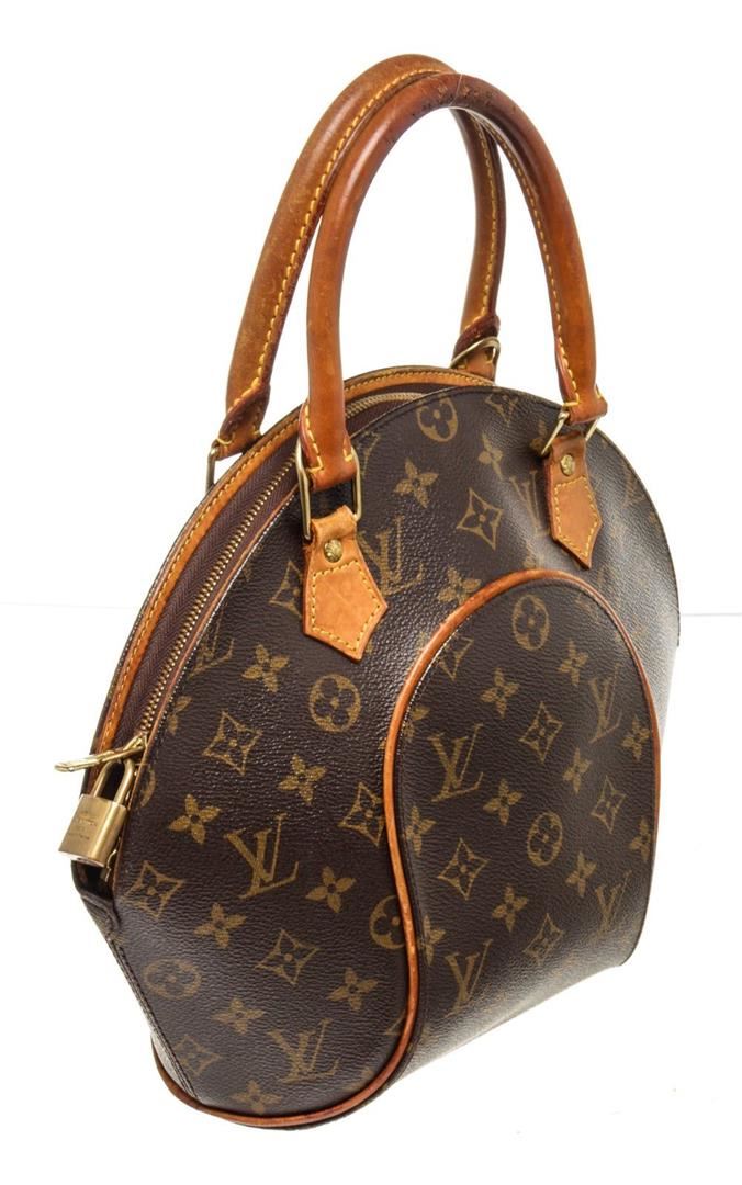 Louis Vuitton Brown Monogram Canvas Ellipse PM Satchel Bag with monogram canvas, brass hardware, tan vachetta leather accents, dual rolled top handles, brown canvas lining, single pocket at interior wall and zip closure at top.
