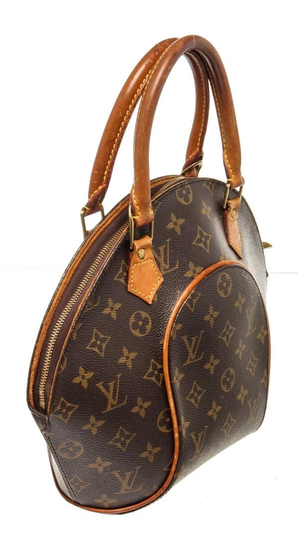 Louis Vuitton Brown Monogram Canvas Ellipse PM Satchel Bag with monogram canvas, brass hardware, tan vachetta leather accents, dual rolled top handles, brown canvas lining, single pocket at interior wall and zip closure at top.