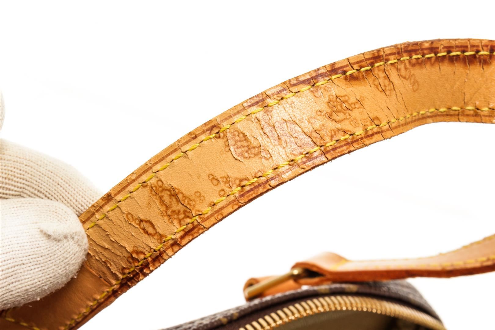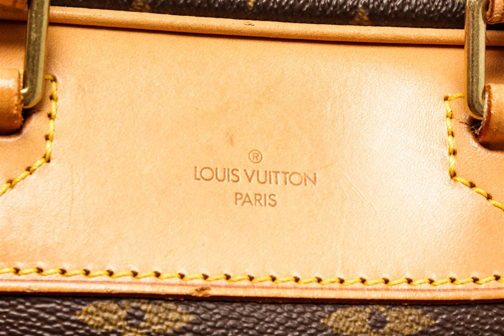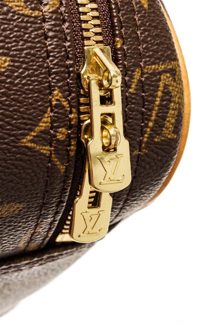Louis Vuitton Brown Monogram Canvas Excursion Handbag. All available information is listed in the description and shown in the photos. Louis Vuitton Brown Monogram Canvas Excursion Handbag with top vachetta handle, canvas lining, gold tone hardware and zipper closure. 10"W x 13.5"H x 5"D 5" handle drop / 25.4 x 34.2 x 12.7 Cm
