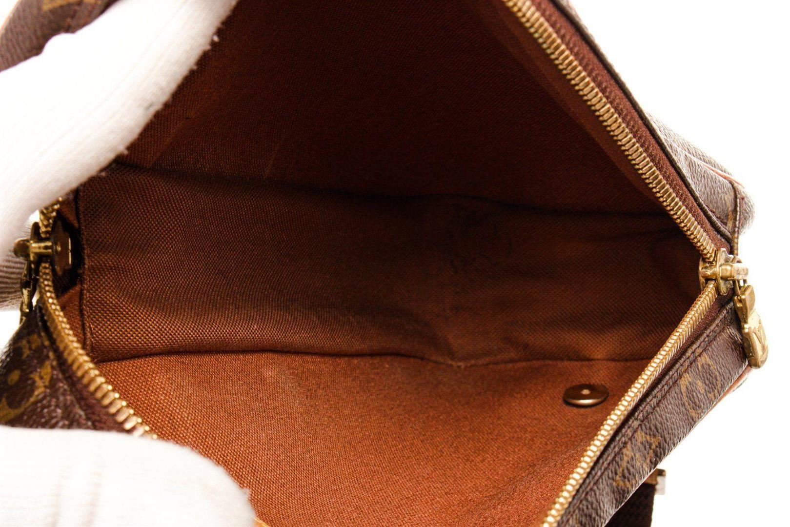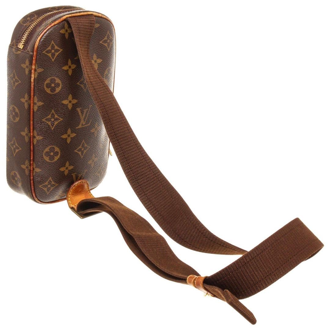 Louis Vuitton Brown Monogram Canvas Gange Crossbody Bag with monogram canvas, gold-tone hardware, tan vachetta leather trim, shoulder strap, and zipper closure.
