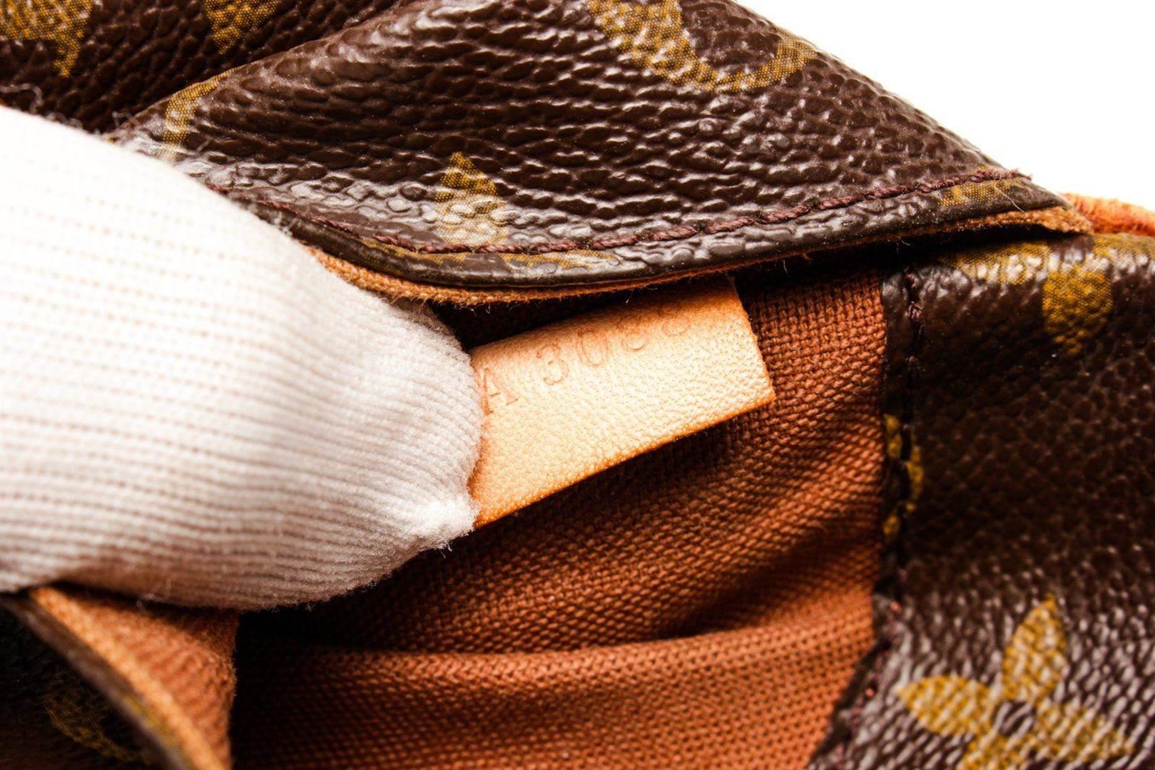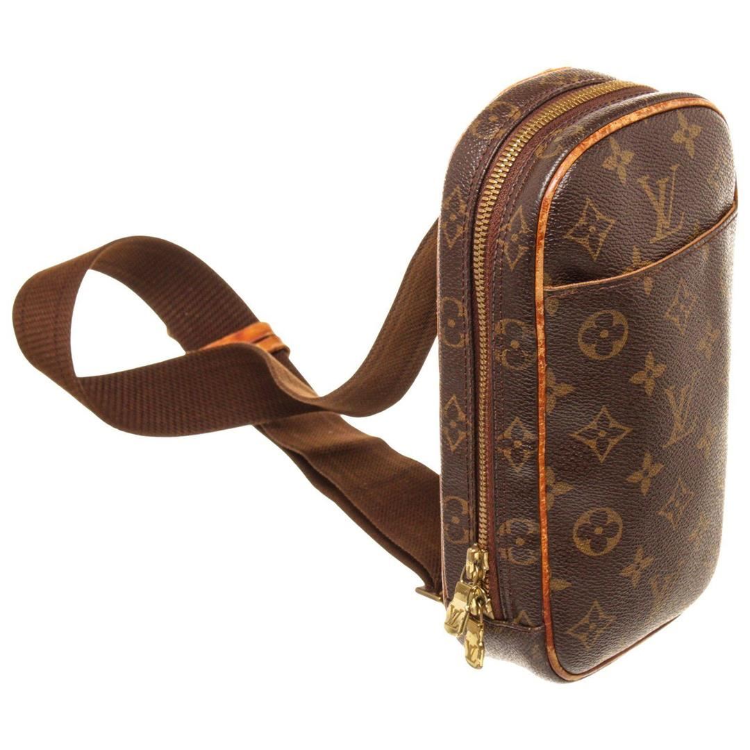 Louis Vuitton Brown Monogram Canvas Gange Crossbody Bag with monogram canvas, gold-tone hardware, tan vachetta leather trim, shoulder strap, and zipper closure.