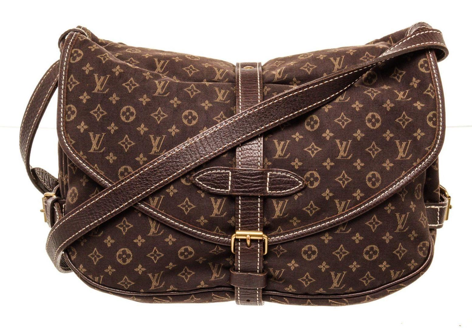 Louis Vuitton Brown Monogram Canvas Idylle Saumur Crossbody Bag with monogram canvas, brass hardware, midnight leather trim, single flat shoulder strap with buckle adjustments, buckle accents at sides, dual compartments, navy canvas lining, single interio