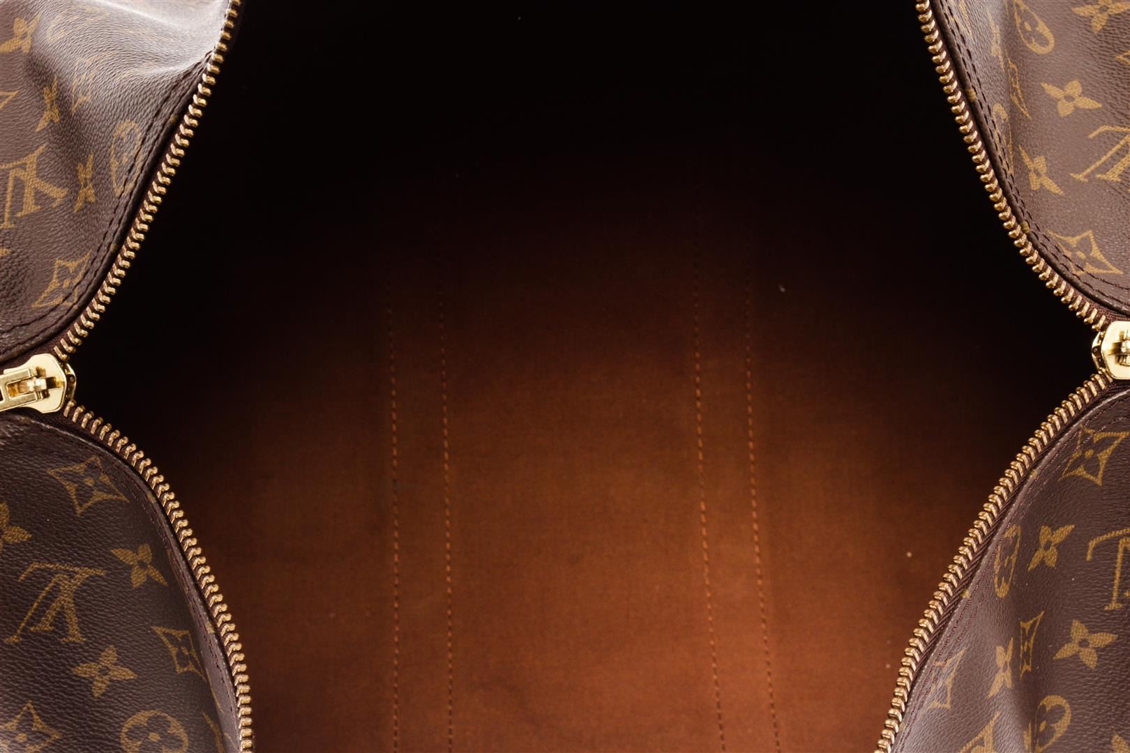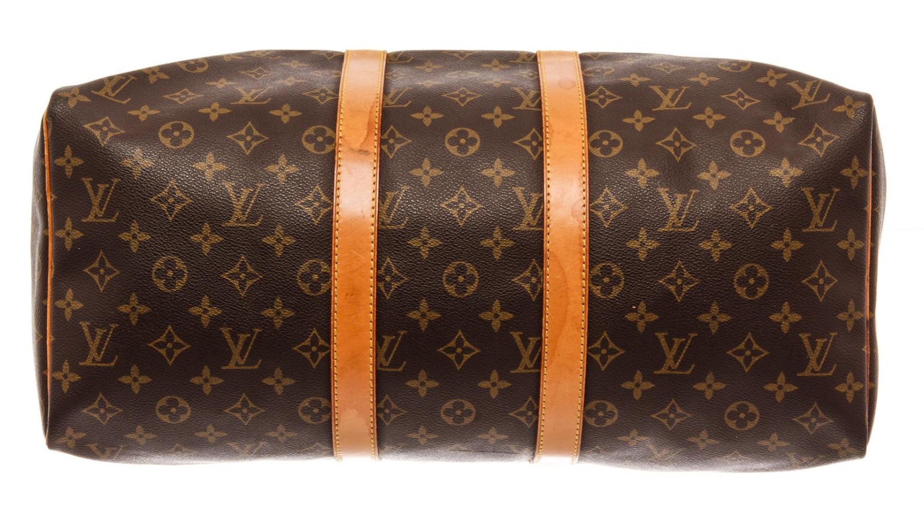 Louis Vuitton Brown Monogram Canvas Keepall 45 Travel Bag. All available information is listed in the description and shown in the photos. Louis Vuitton Brown Monogram Canvas Keepall 45 Travel Bag with brown coated canvas, brass hardware, dual rolled handles, leather trim embellishment, canvas lining, zip closure at top. Height: 10" Width: 18" Depth: 8", Handle Drop: 4.5" / 25.4 x 45.72 x 20.32 Cm