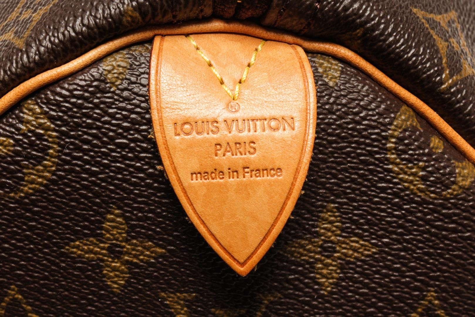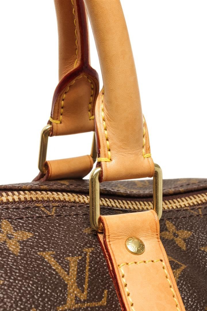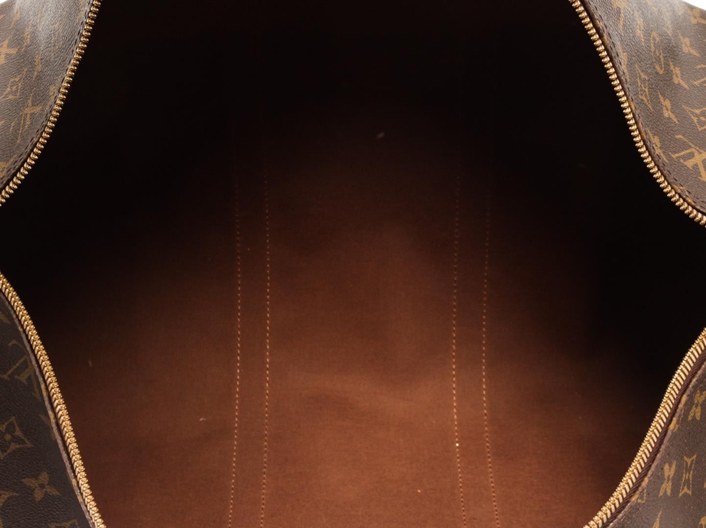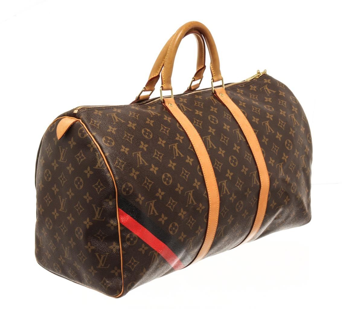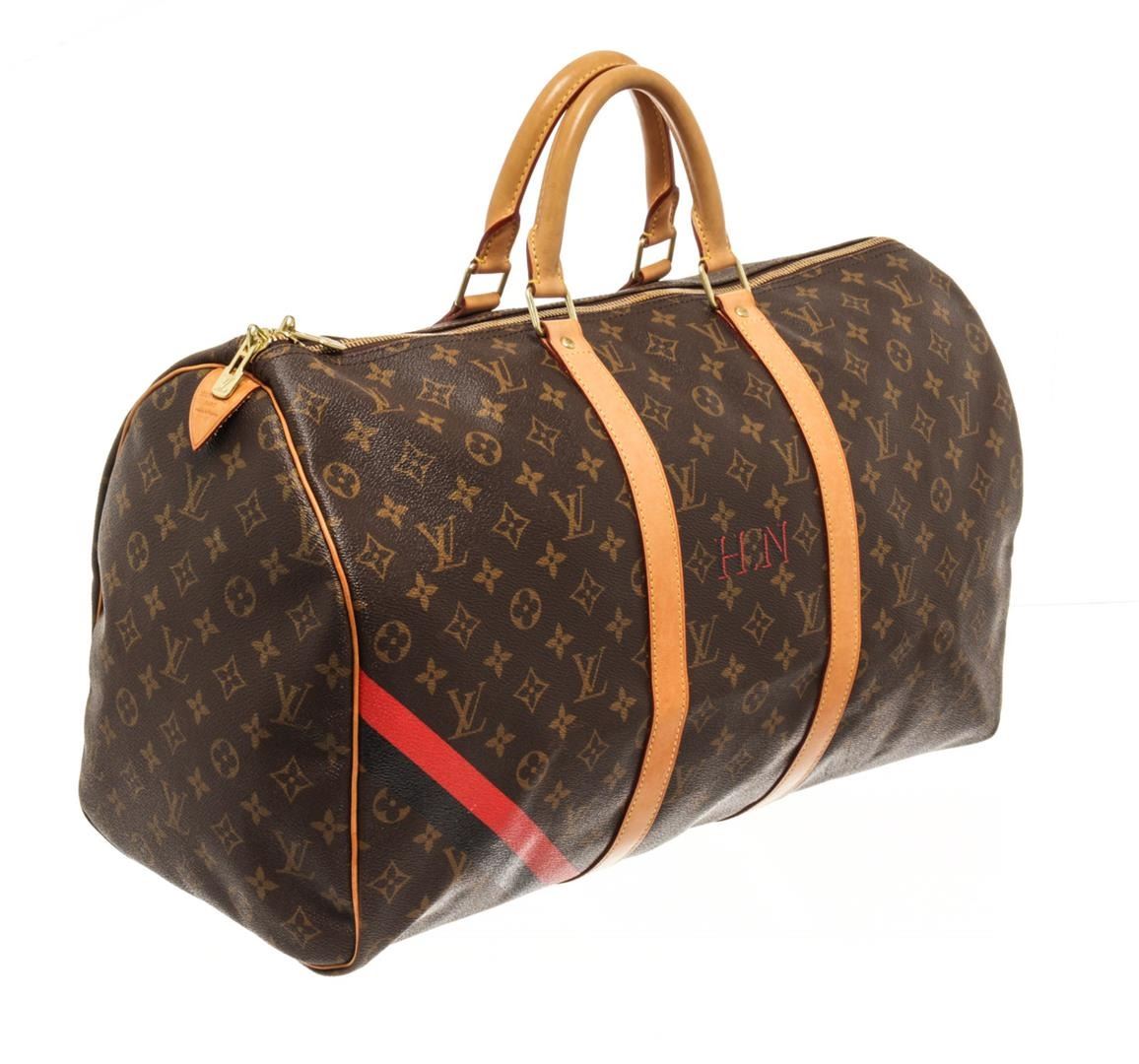 One Louis Vuitton Brown Monogram Canvas Keepall 50 Travel Bag. Item is sold AS-IS. All available information is listed in the description and shown in the photo. Louis Vuitton Brown Monogram Canvas Keepall 50 Travel Bag with gold-tone hardware, tan vachetta leather trim, dual rolled handles, brown canvas lining and zip closure at top. There are initials of "H.N." on front, black and red stripe from corner to corner. Please refer to photos.