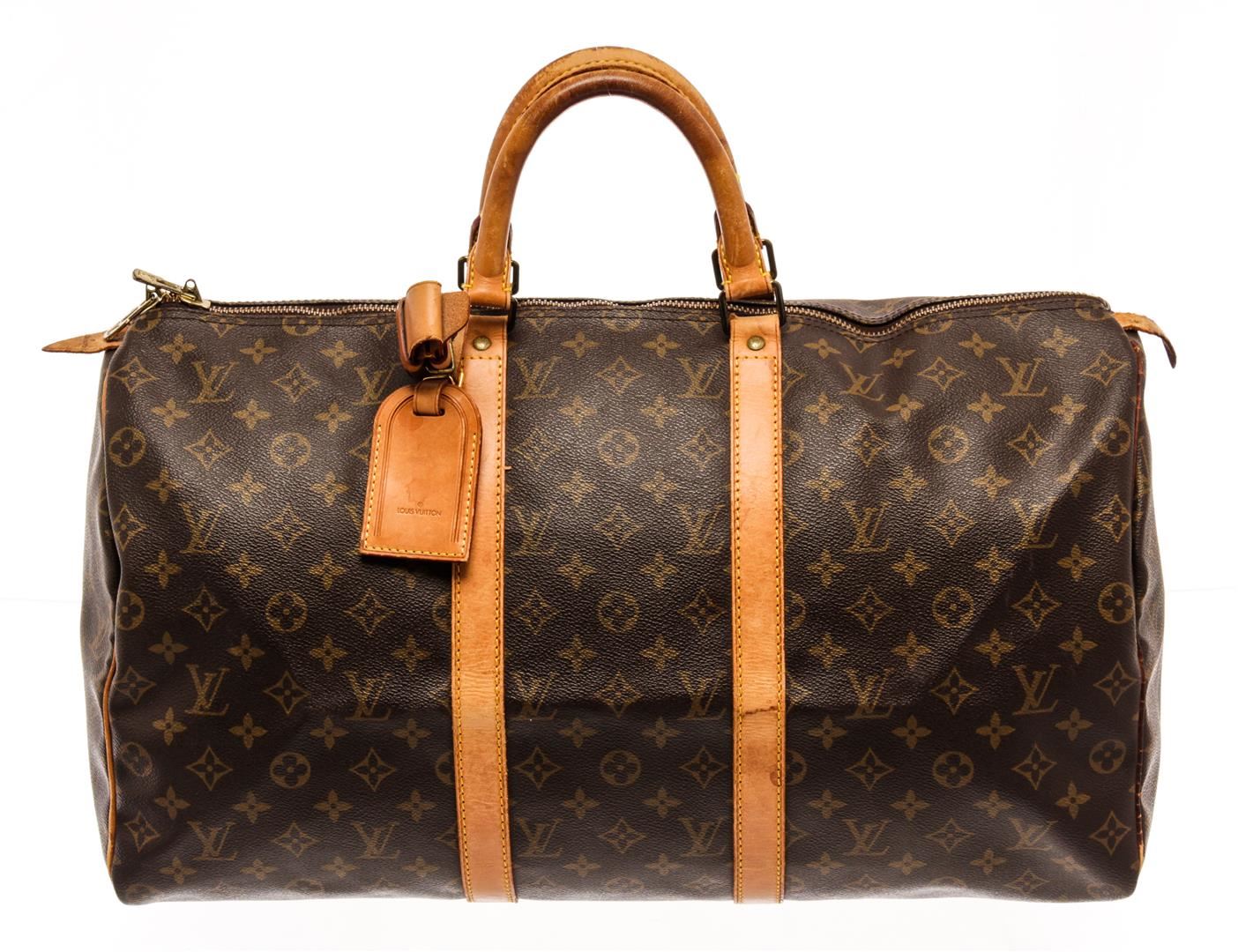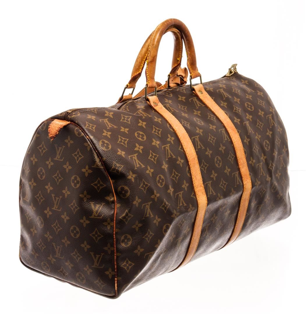 Louis Vuitton Brown Monogram Canvas Keepall 50 Travel Bag. All available information is listed in the description and shown in the photos. Louis Vuitton Brown Monogram Canvas Keepall 50 Travel Bag with gold-tone hardware, trim tan vachetta leather, brown canvas lining, leather trim inside, golden brass, rounded leather handles. Depth 8.3 in, Width 19.7 in/ Depth 21 cm, Width 50 cm