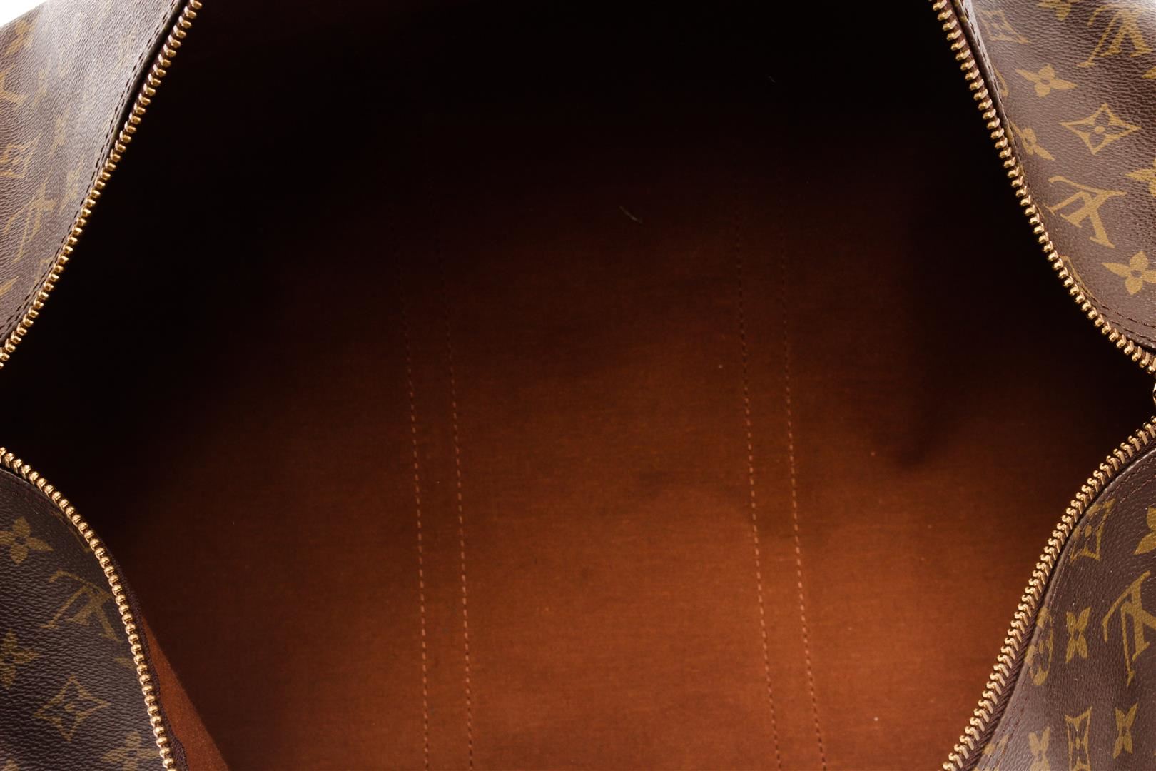 Louis Vuitton Brown Monogram Canvas Keepall 50 Travel Bag. All available information is listed in the description and shown in the photos. Louis Vuitton Brown Monogram Canvas Keepall 50 Travel Bag with brown coated canvas, brass hardware, leather trim, dual rolled handles, canvas lining, luggage tag, zip closure at top. Height: 13" Width: 19.5" Depth: 8.5", Handle Drop: 4.25" / 33.02 x 49.53 x 21.59 Cm