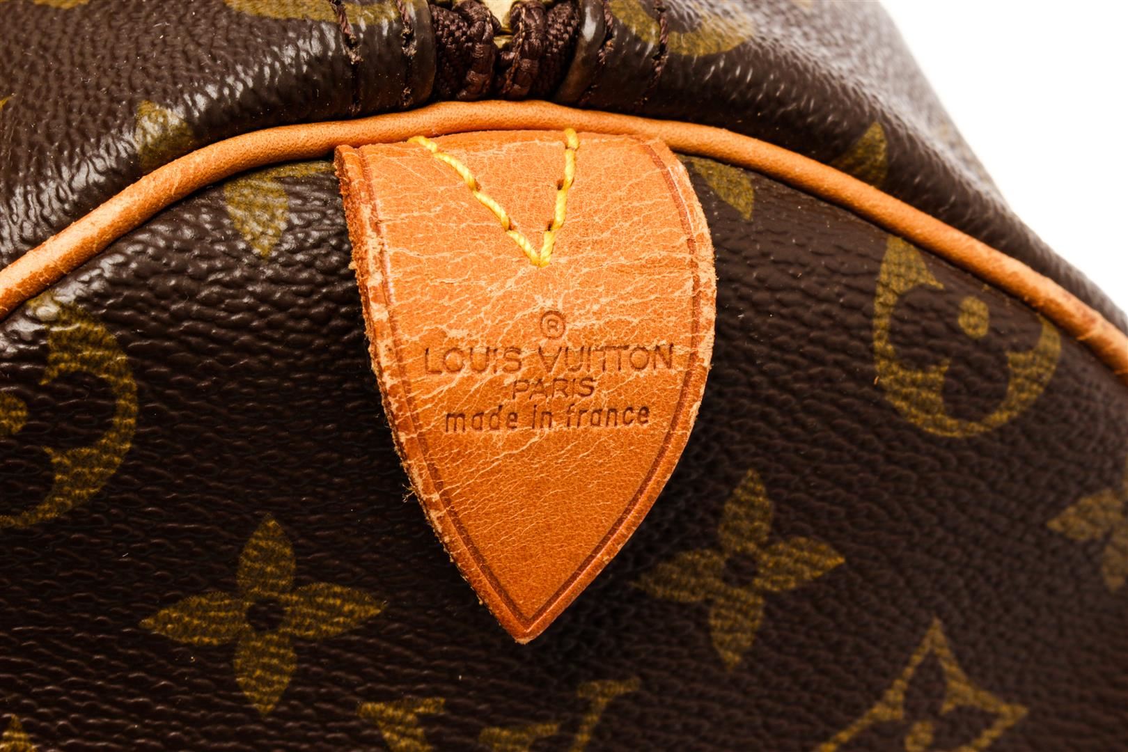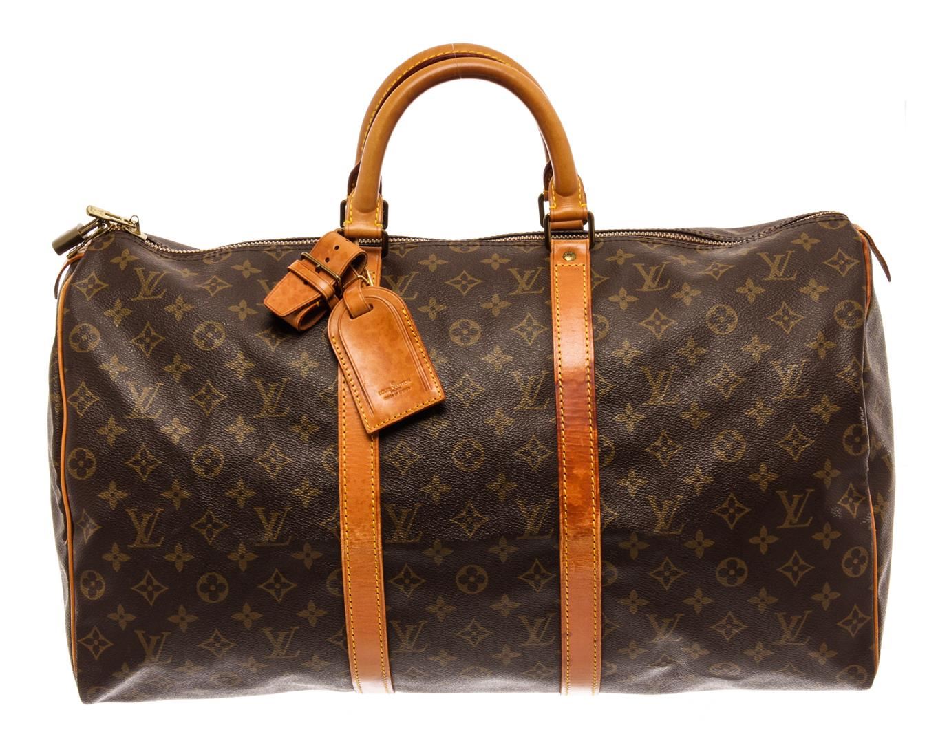 Louis Vuitton Brown Monogram Canvas Keepall 50 Travel Bag. All available information is listed in the description and shown in the photos. Louis Vuitton Brown Monogram Canvas Keepall 50 Travel Bag with brown coated canvas, brass hardware, leather trim, dual rolled handles, canvas lining, luggage tag, zip closure at top. Height: 13" Width: 19.5" Depth: 8.5", Handle Drop: 4.25" / 33.02 x 49.53 x 21.59 Cm