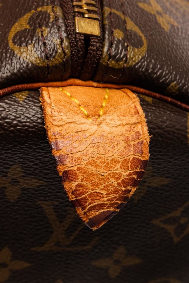 Louis Vuitton Brown Monogram Canvas Keepall 50 Travel Bag. All available information is listed in the description and shown in the photos. Louis Vuitton Brown Monogram Canvas Keepall 50 Travel Bag with gold-tone hardware, trim tan vachetta leather, brown canvas lining, leather trim inside, golden brass, rounded leather handles. Depth 8.3 in, Width 19.7 in/ Depth 21 cm, Width 50 cm