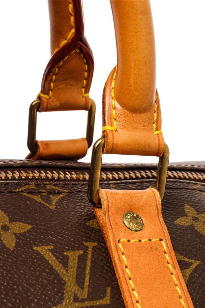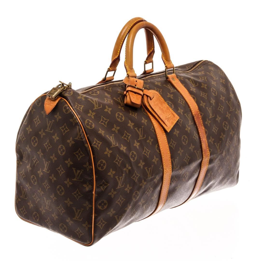 Louis Vuitton Brown Monogram Canvas Keepall 50 Travel Bag. All available information is listed in the description and shown in the photos. Louis Vuitton Brown Monogram Canvas Keepall 50 Travel Bag with brown coated canvas, brass hardware, leather trim, dual rolled handles, canvas lining, luggage tag, zip closure at top. Height: 13" Width: 19.5" Depth: 8.5", Handle Drop: 4.25" / 33.02 x 49.53 x 21.59 Cm