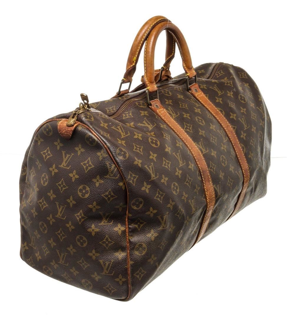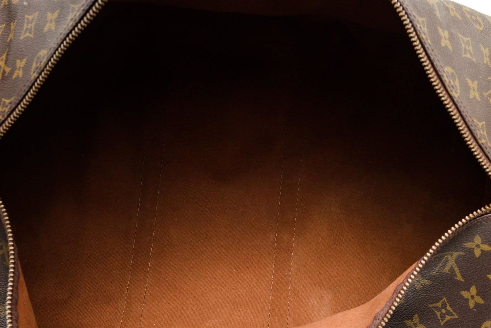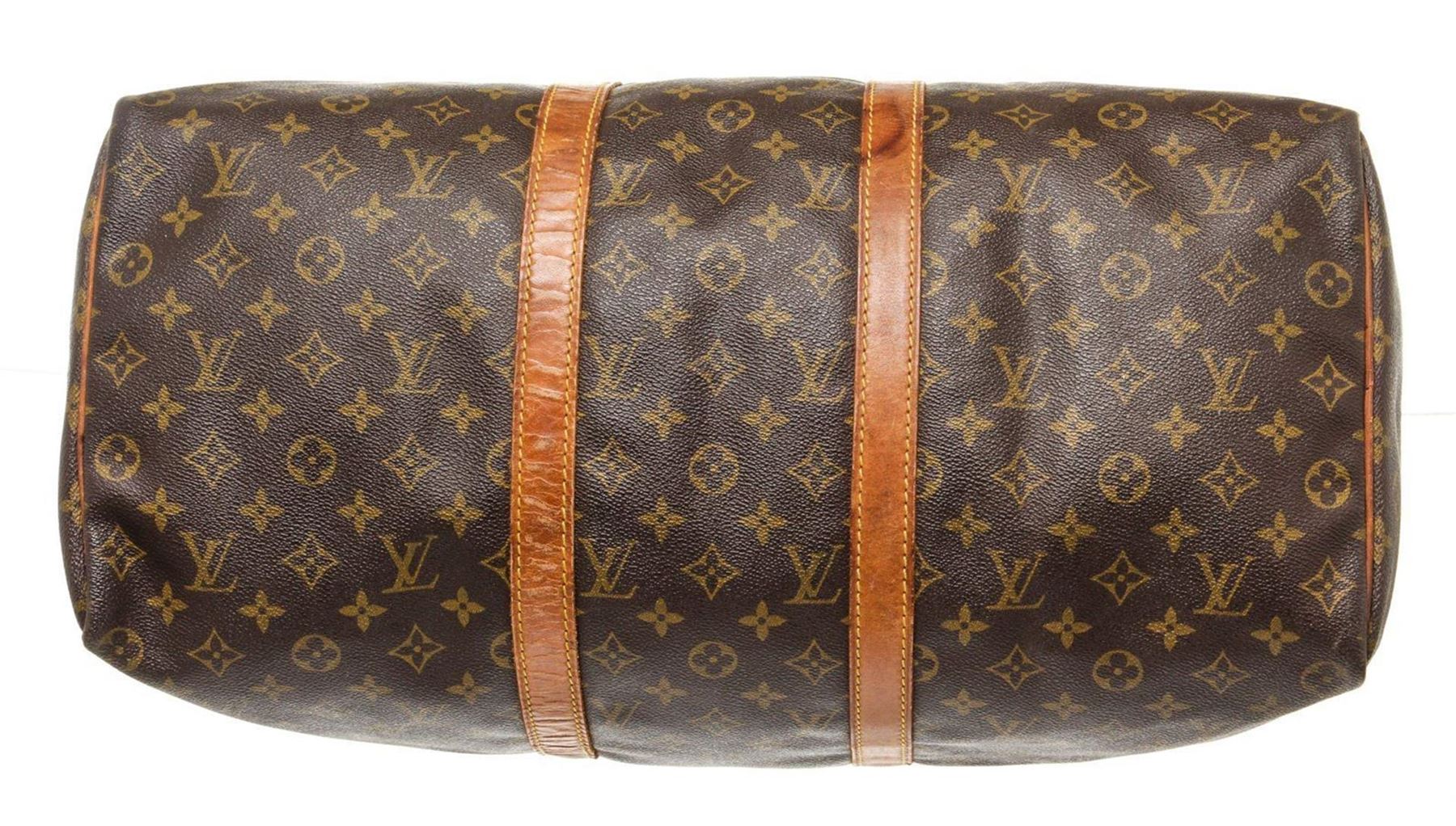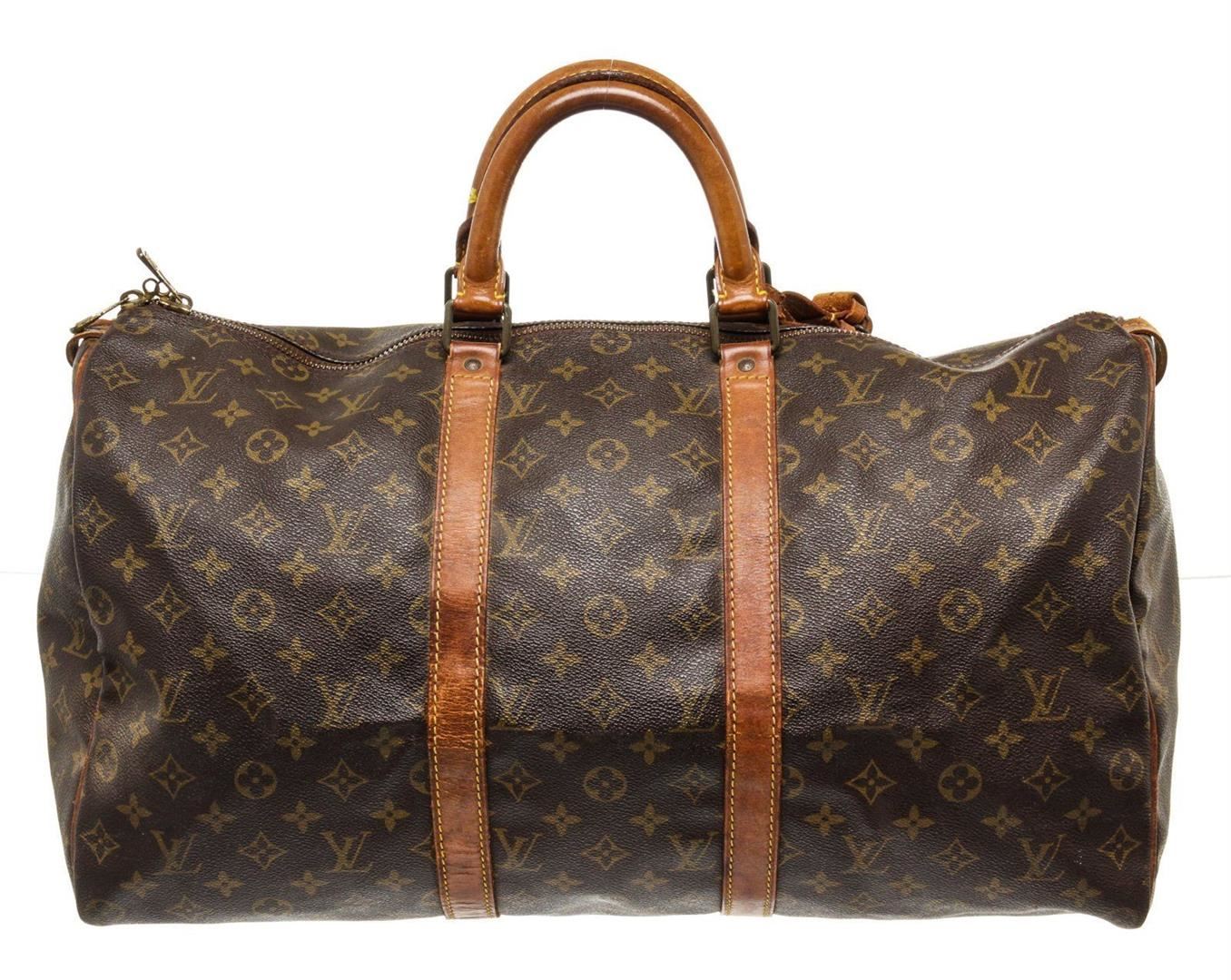 Louis Vuitton Brown Monogram Canvas Keepall 50cm Travel Bag with monogram canvas, gold-tone hardware, trim tan vachetta leather, dual top handle, adjustable shoulder strap and zipper closure.