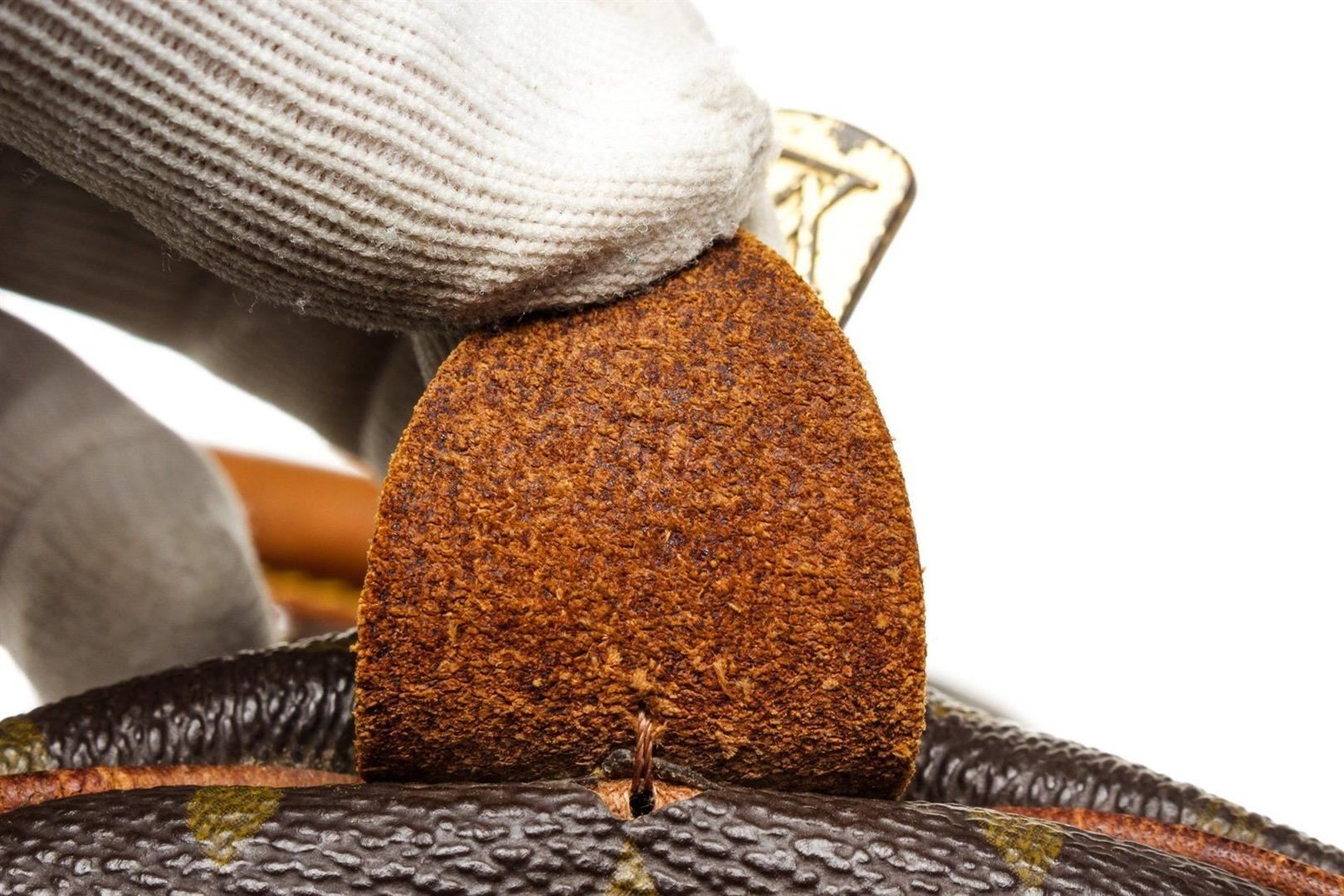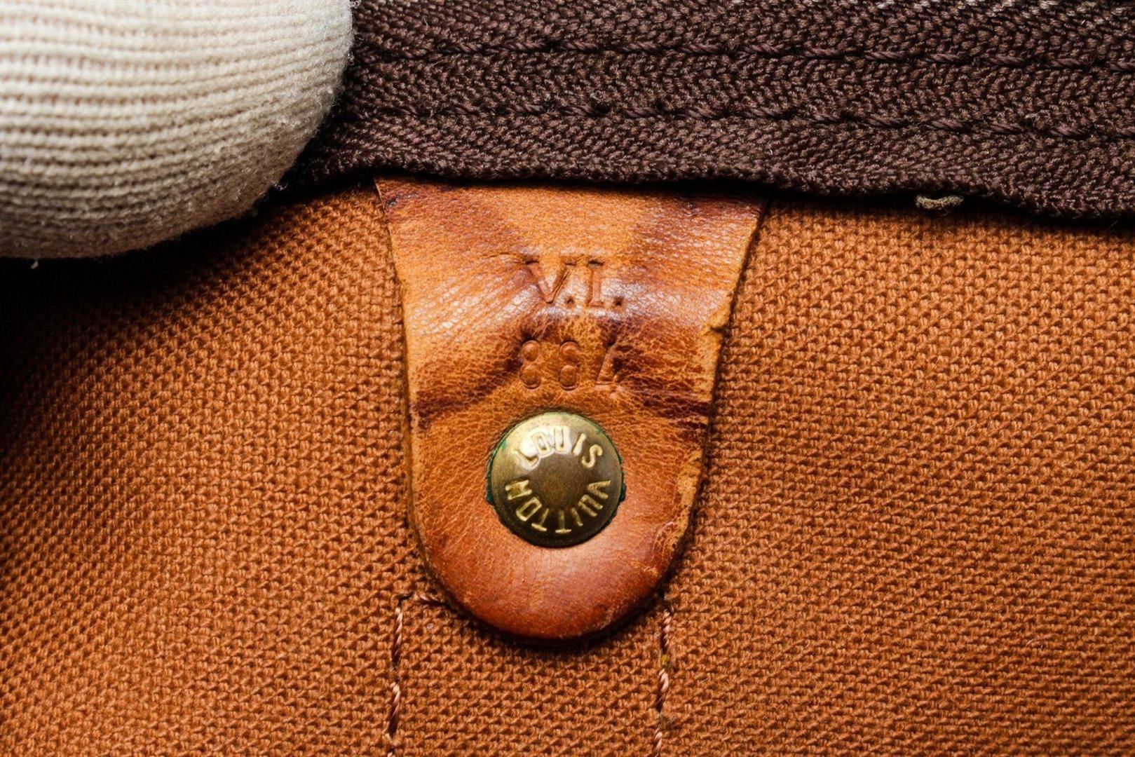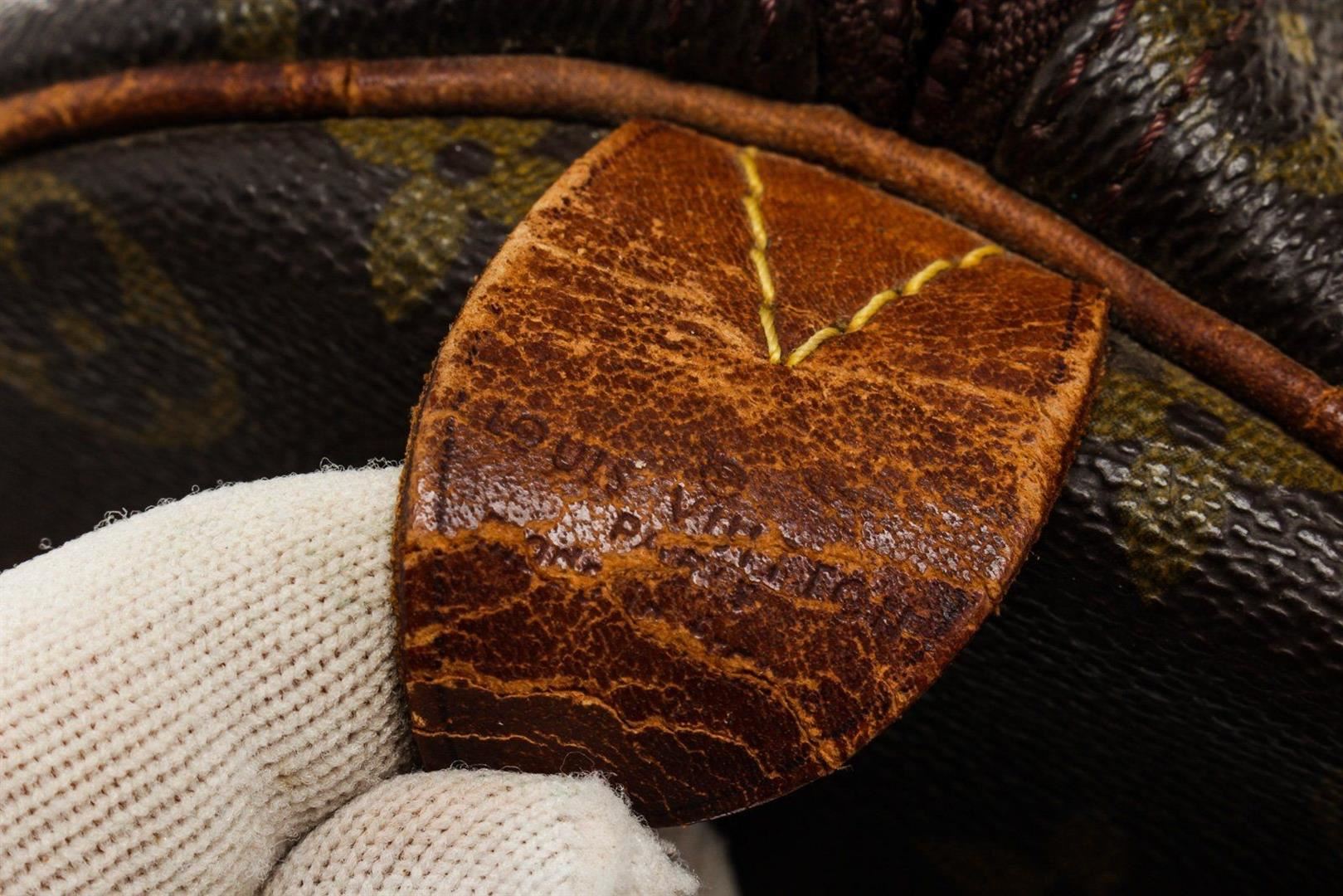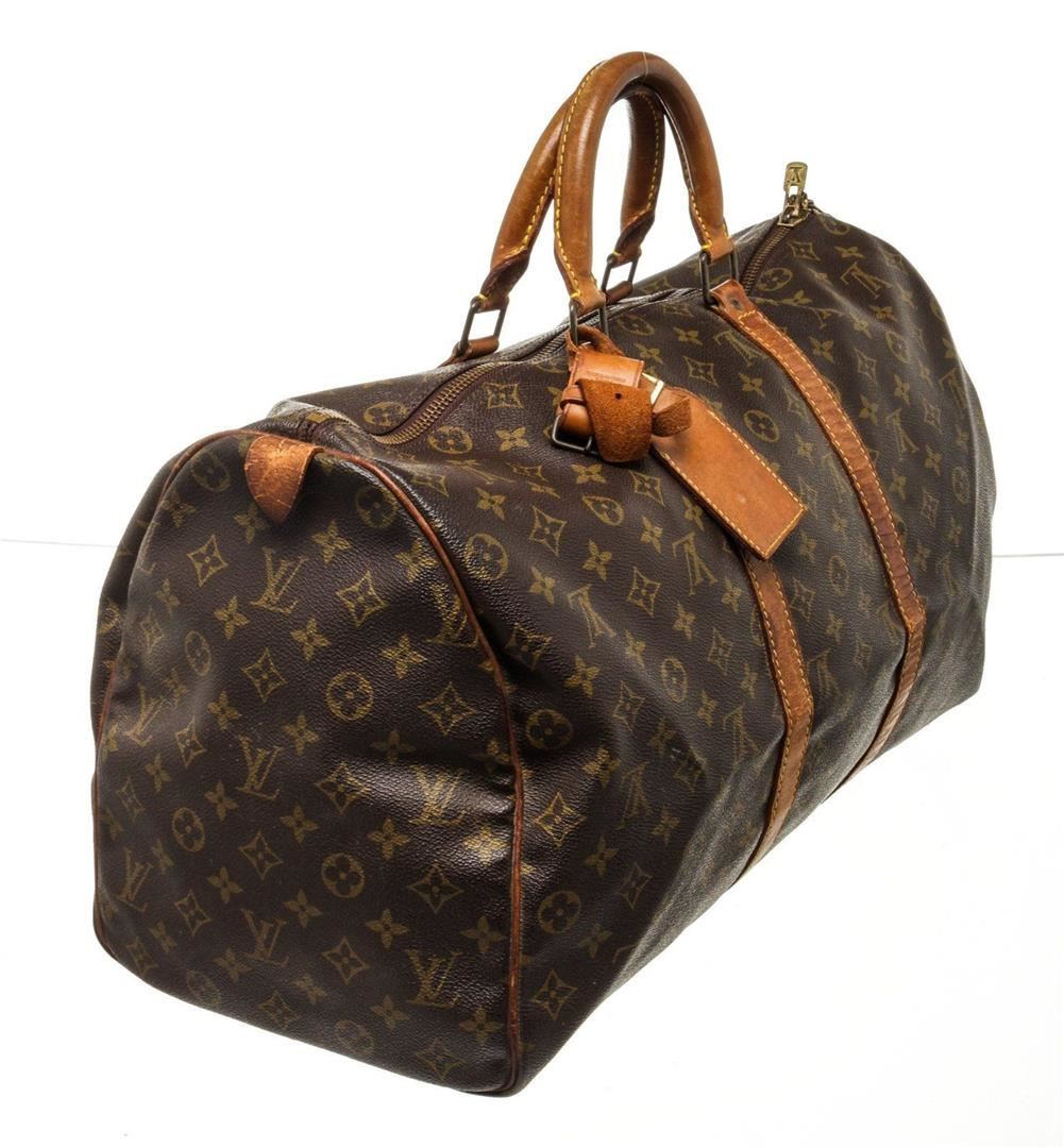 Louis Vuitton Brown Monogram Canvas Keepall 50cm Travel Bag with monogram canvas, gold-tone hardware, trim tan vachetta leather, dual top handle, adjustable shoulder strap and zipper closure.