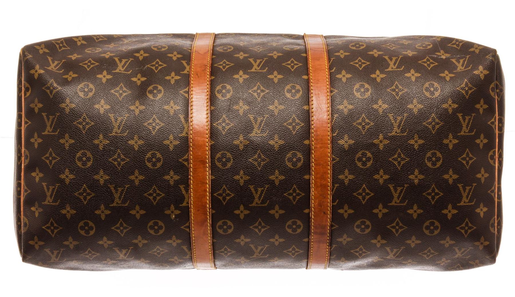 Louis Vuitton Brown Monogram Canvas Keepall 55 Travel Bag. All available information is listed in the description and shown in the photos. Louis Vuitton Brown Monogram Canvas Keepall 55 Travel Bag with gold-tone hardware, trim tan vachetta leather, brown canvas lining, leather trim inside, golden brass pieces, rounded leather handles. W55cm x H27cm x D25cm / 21.65" x 10.62" x 9.84"