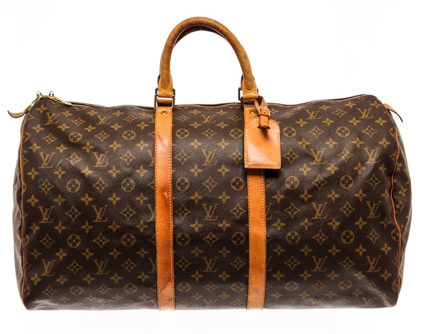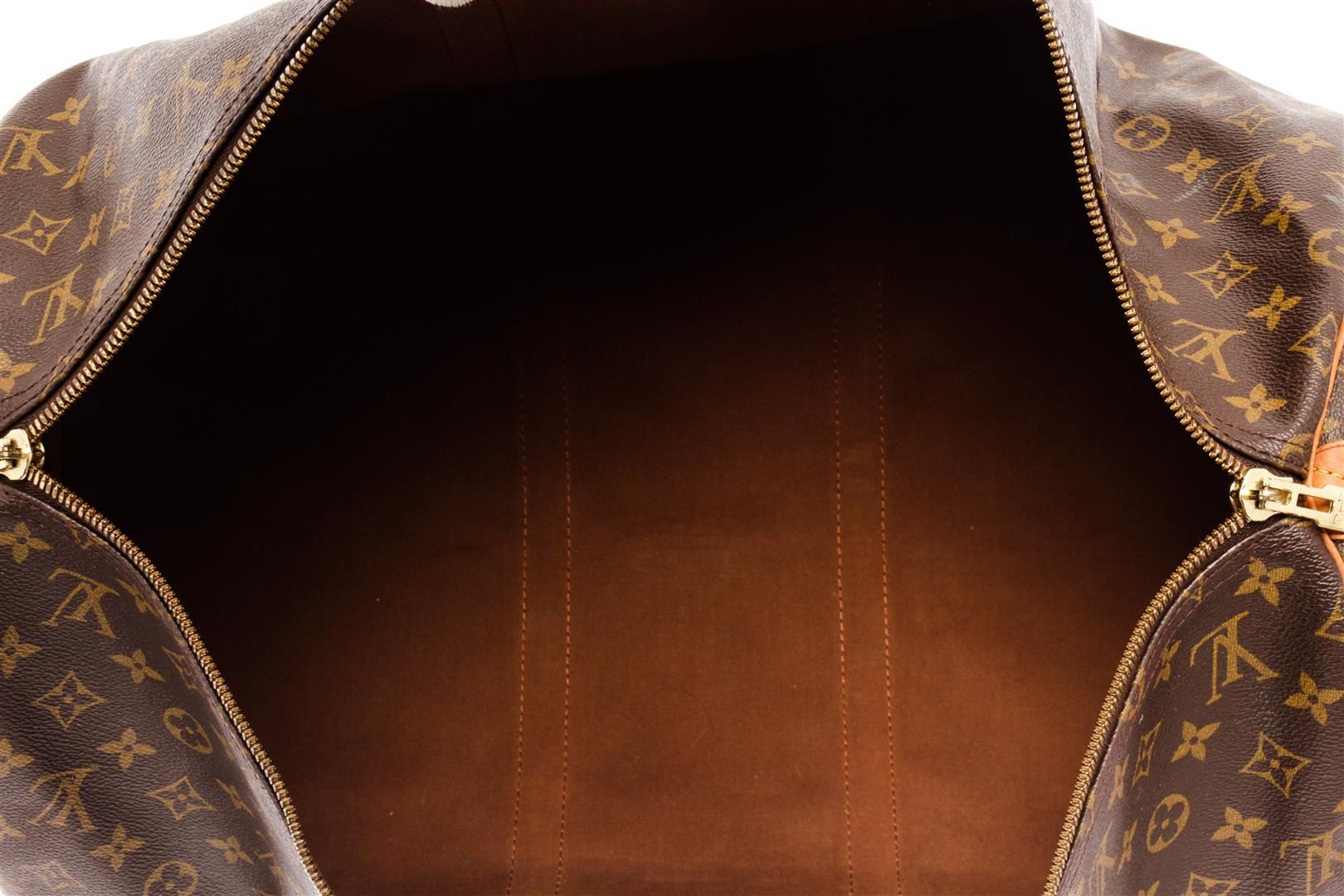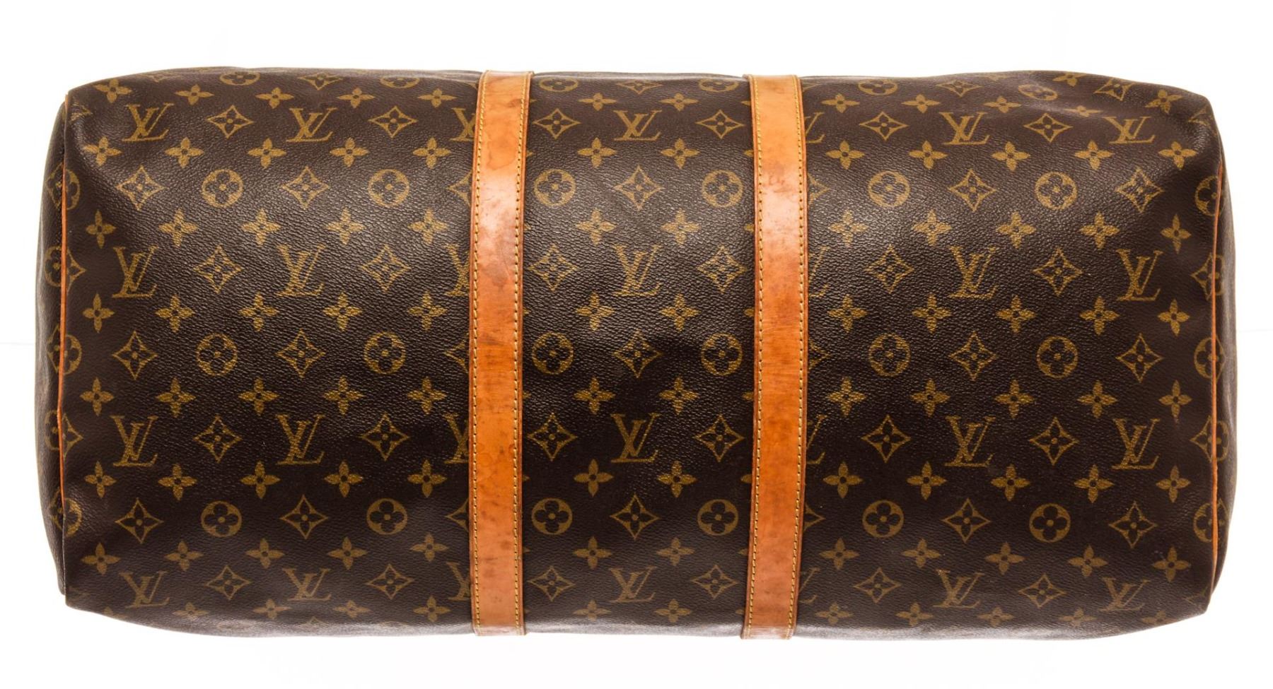 Louis Vuitton Brown Monogram Canvas Keepall 55 Travel Bag. All available information is listed in the description and shown in the photos. Louis Vuitton Brown Monogram Canvas Keepall 55 Travel Bag with gold-tone hardware, trim tan vachetta leather, brown canvas lining, leather trim inside, golden brass pieces, rounded leather handles. W55cm x H27cm x D25cm / 21.65" x 10.62" x 9.84"