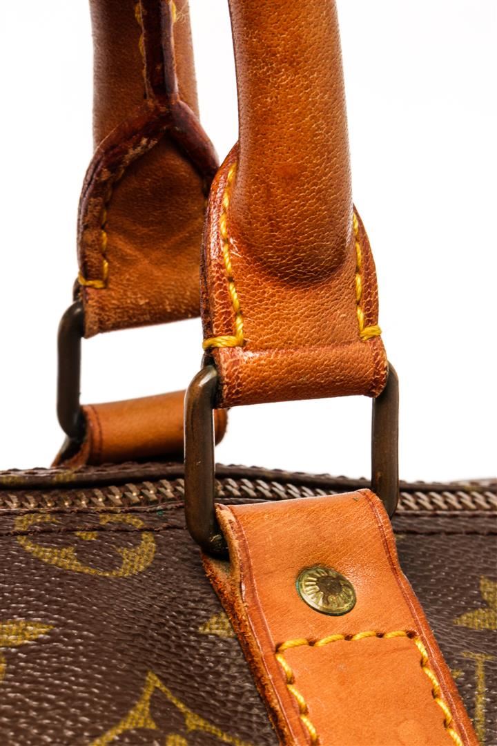 Louis Vuitton Brown Monogram Canvas Keepall 55 Travel Bag. All available information is listed in the description and shown in the photos. Louis Vuitton Brown Monogram Canvas Keepall 55 Travel Bag with gold-tone hardware, trim tan vachetta leather, brown canvas lining, leather trim inside, golden brass pieces, rounded leather handles. W55cm x H27cm x D25cm / 21.65" x 10.62" x 9.84"