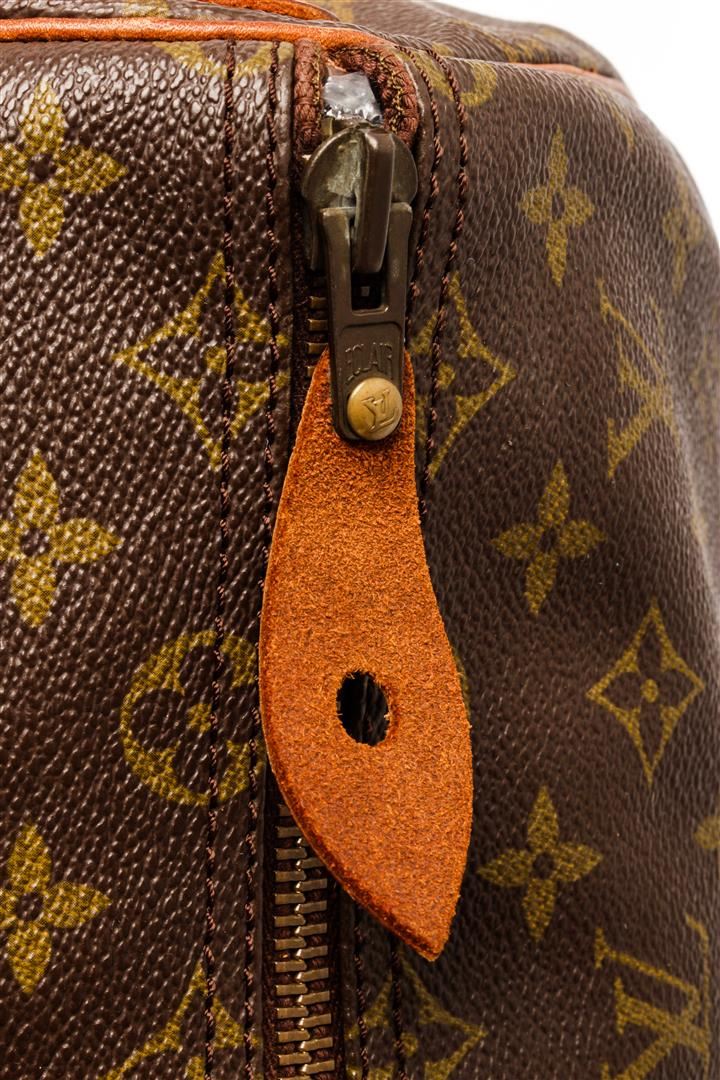 Louis Vuitton Brown Monogram Canvas Keepall 55 Travel Bag. All available information is listed in the description and shown in the photos. Louis Vuitton Brown Monogram Canvas Keepall 55 Travel Bag with gold-tone hardware, trim tan vachetta leather, brown canvas lining, leather trim inside, golden brass pieces, rounded leather handles. W55cm x H27cm x D25cm / 21.65" x 10.62" x 9.84"