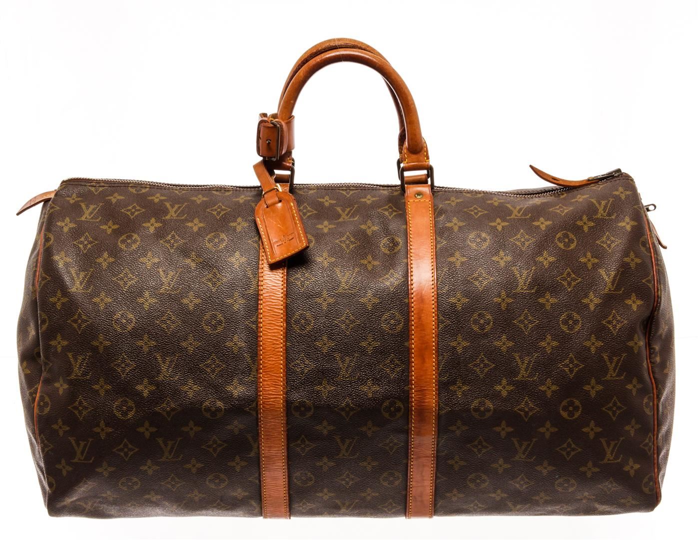 Louis Vuitton Brown Monogram Canvas Keepall 55 Travel Bag. All available information is listed in the description and shown in the photos. Louis Vuitton Brown Monogram Canvas Keepall 55 Travel Bag with gold-tone hardware, trim tan vachetta leather, brown canvas lining, leather trim inside, golden brass pieces, rounded leather handles. W55cm x H27cm x D25cm / 21.65" x 10.62" x 9.84"