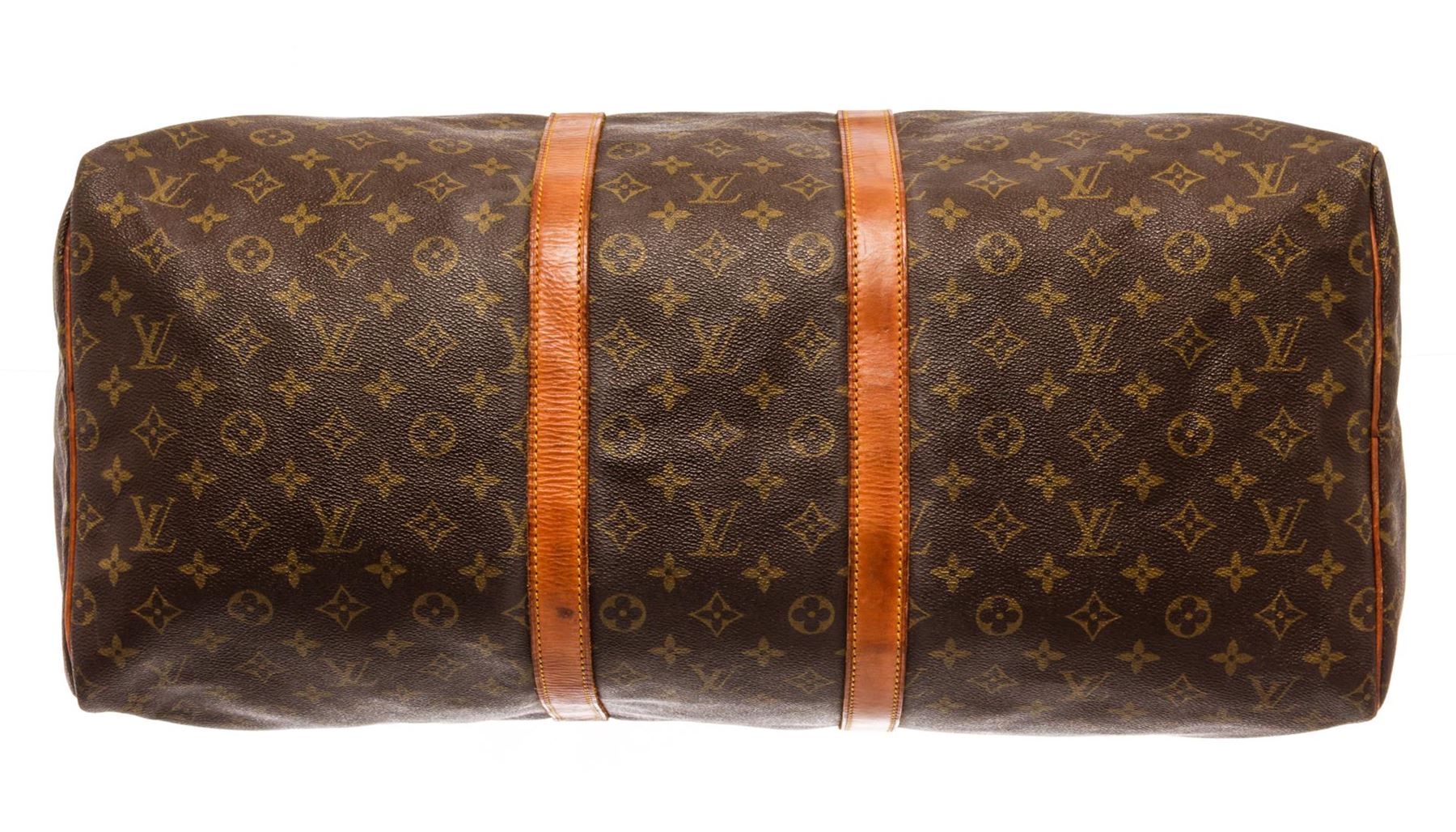 Louis Vuitton Brown Monogram Canvas Keepall 55 Travel Bag. All available information is listed in the description and shown in the photos. Louis Vuitton Brown Monogram Canvas Keepall 55 Travel Bag with gold-tone hardware, trim tan vachetta leather, brown canvas lining, leather trim inside, golden brass pieces, rounded leather handles. W55cm x H27cm x D25cm / 21.65" x 10.62" x 9.84"