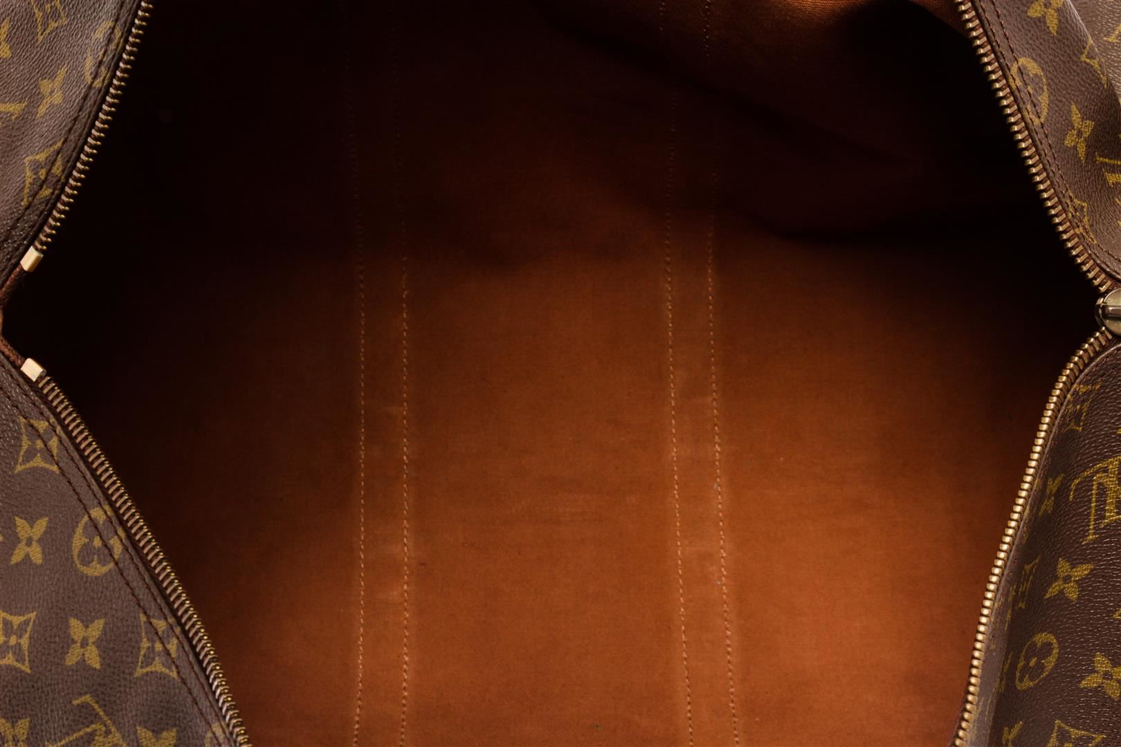 Louis Vuitton Brown Monogram Canvas Keepall 55 Travel Bag. All available information is listed in the description and shown in the photos. Louis Vuitton Brown Monogram Canvas Keepall 55 Travel Bag with gold-tone hardware, trim tan vachetta leather, brown canvas lining, leather trim inside, golden brass pieces, rounded leather handles. W55cm x H27cm x D25cm / 21.65" x 10.62" x 9.84"