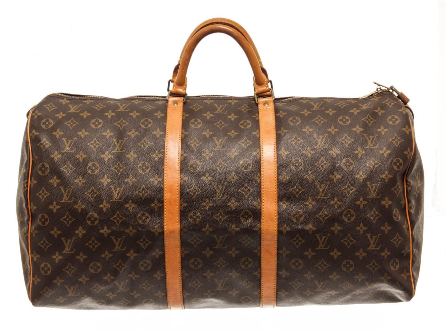 One Louis Vuitton Brown Monogram Canvas Keepall 60 Duffel Bag. Item is sold AS-IS. All available information is listed in the description and shown in the photo. Louis Vuitton Brown Monogram Canvas Keepall 60 Duffel Bag with top handle, lock & key, canvas lining, gold tone hardware, zipper closure. There is some wear on the vachetta, hardware is tarnished. Please refer to photos. 23.5 X 10.2 X 13.0 / 59.69 x 25.90 x 33.02 cm