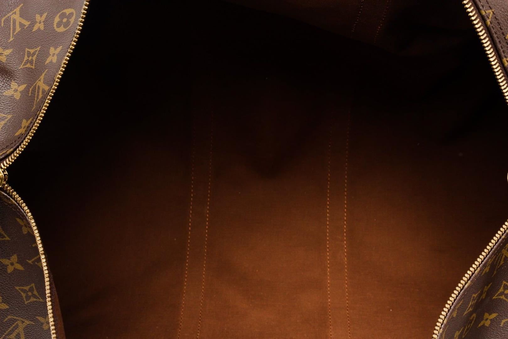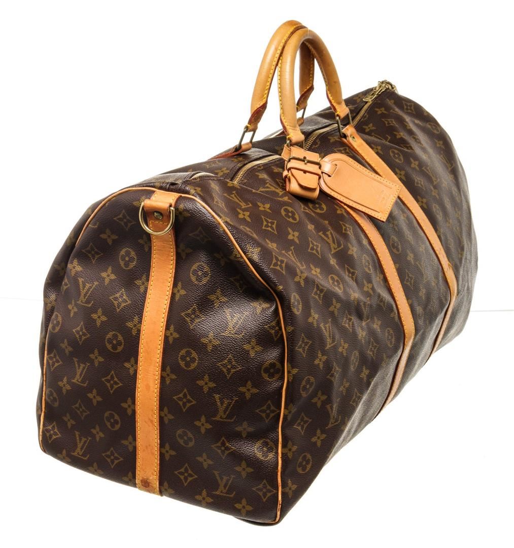 Louis Vuitton Brown Keepall 60cm Travel Bag with material monogram canvas, gold-tone hardware, trim tan vachetta leather, leather lining, dual top handle, and zipper closure.