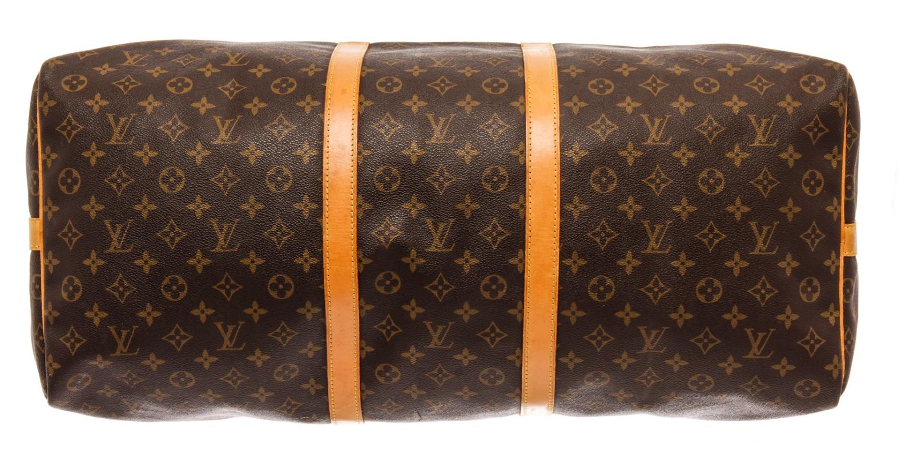 Louis Vuitton Brown Monogram Canvas Keepall Bandoulière 60 Travel Bag. All available information is listed in the description and shown in the photos. Louis Vuitton Brown Monogram Canvas Keepall Bandoulière 60 Travel Bag with brown coated canvas, brass hardware, dual rolled handles & single adjustable shoulder strap, canvas lining, zip closure at top. Height: 12" Width: 23" Depth: 10.25", Shoulder Strap Drop : 19-23" / 30.48 x 58.42 x 26.03 Cm