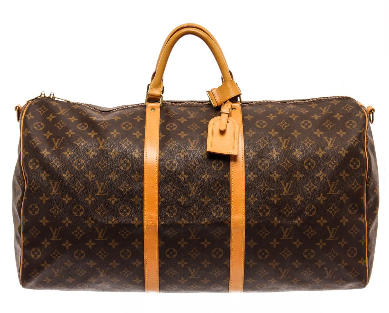 Louis Vuitton Brown Monogram Canvas Keepall Bandoulière 60 Travel Bag. All available information is listed in the description and shown in the photos. Louis Vuitton Brown Monogram Canvas Keepall Bandoulière 60 Travel Bag with brown coated canvas, brass hardware, dual rolled handles & single adjustable shoulder strap, canvas lining, zip closure at top. Height: 12" Width: 23" Depth: 10.25", Shoulder Strap Drop : 19-23" / 30.48 x 58.42 x 26.03 Cm