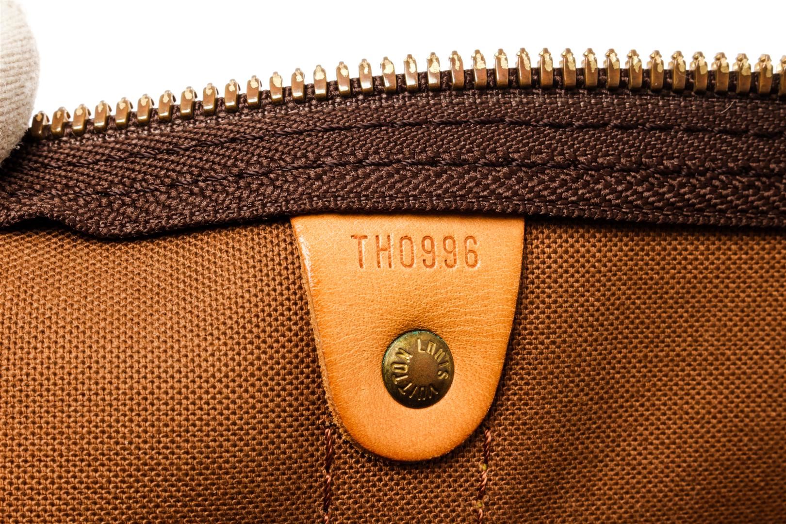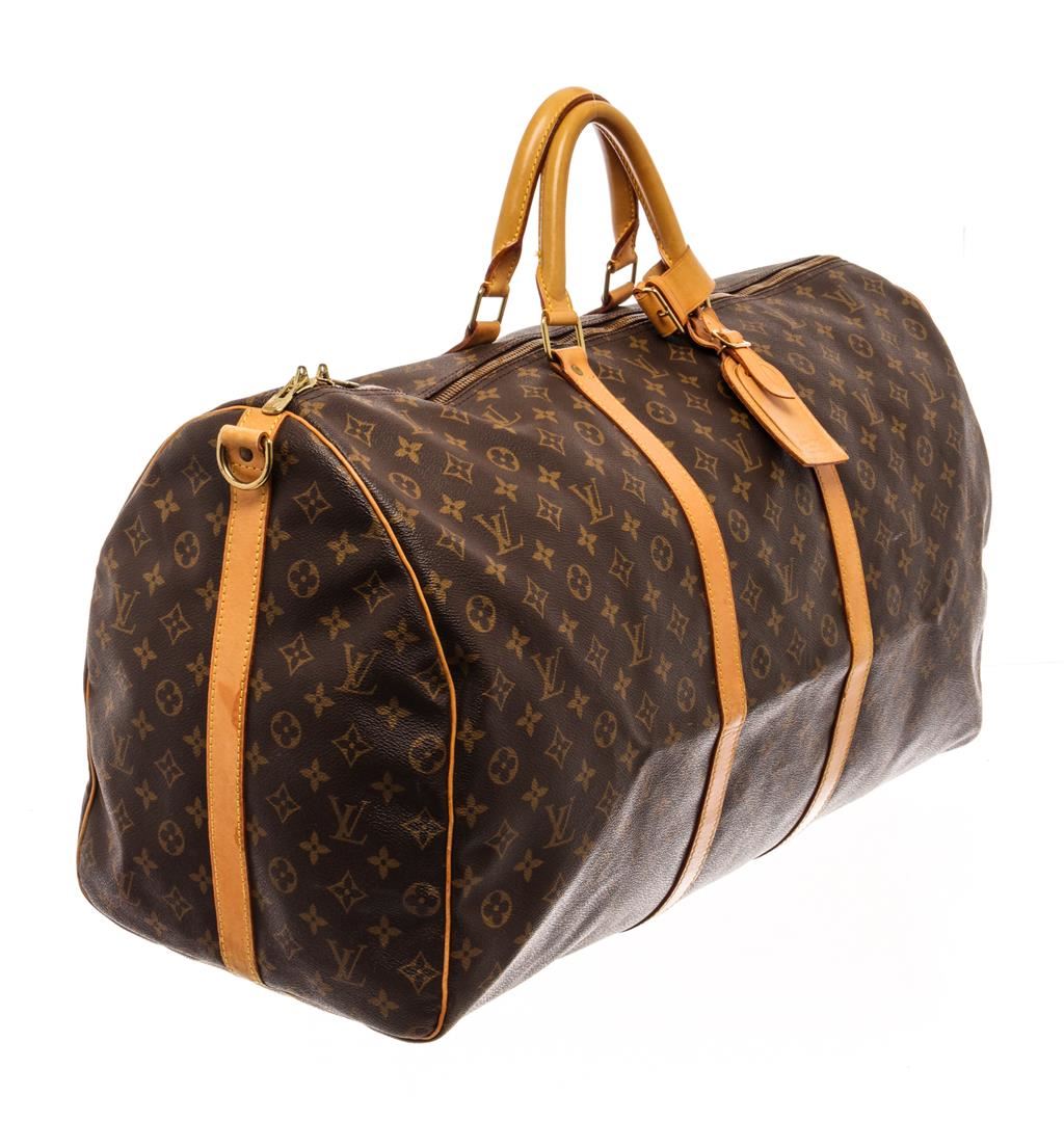 Louis Vuitton Brown Monogram Canvas Keepall Bandoulière 60 Travel Bag. All available information is listed in the description and shown in the photos. Louis Vuitton Brown Monogram Canvas Keepall Bandoulière 60 Travel Bag with brown coated canvas, brass hardware, dual rolled handles & single adjustable shoulder strap, canvas lining, zip closure at top. Height: 12" Width: 23" Depth: 10.25", Shoulder Strap Drop : 19-23" / 30.48 x 58.42 x 26.03 Cm