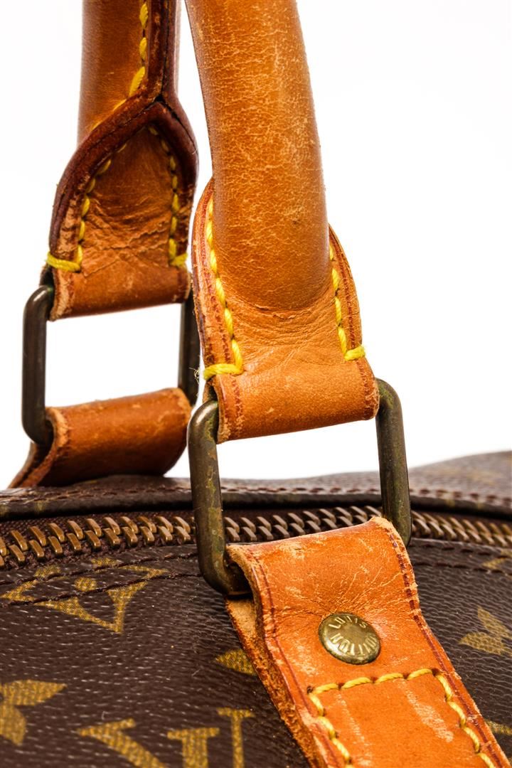 Louis Vuitton Brown Monogram Canvas Keepall Bandouliere 50 Travel Bag. All available information is listed in the description and shown in the photos. Louis Vuitton Brown Monogram Canvas Keepall Bandouliere 50 Travel Bag with a monogram canvas body, rolled leather handles, a detachable shoulder strap, and a top zip closure. 10.8" L x 19.5" W x 8.3" D / 27.43 x 49.53 x 21.08 CM