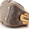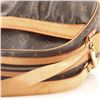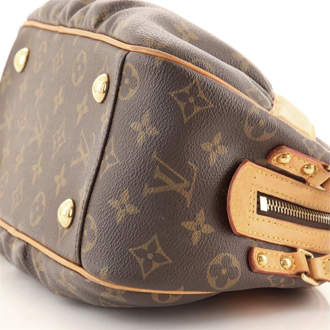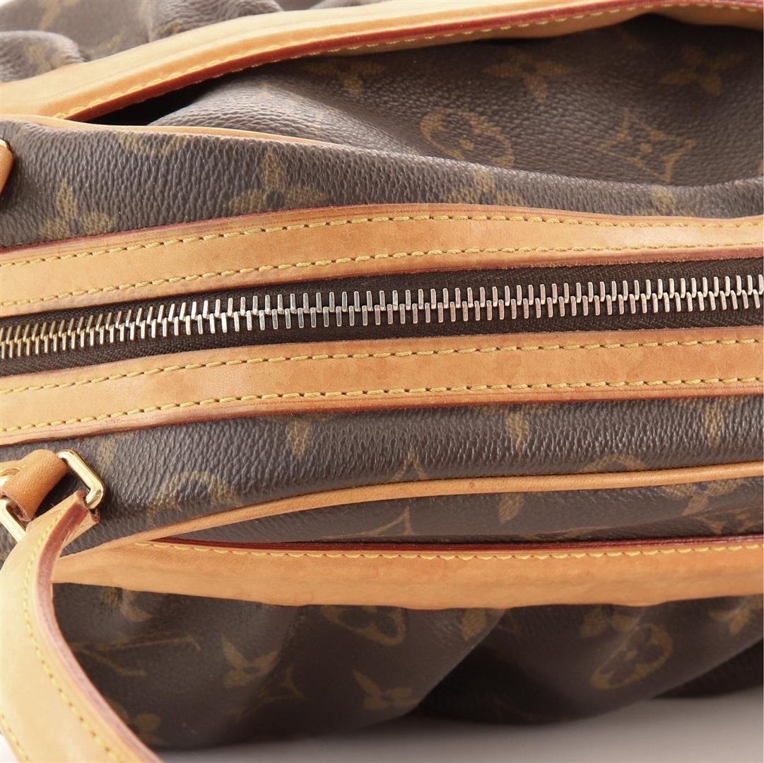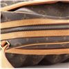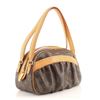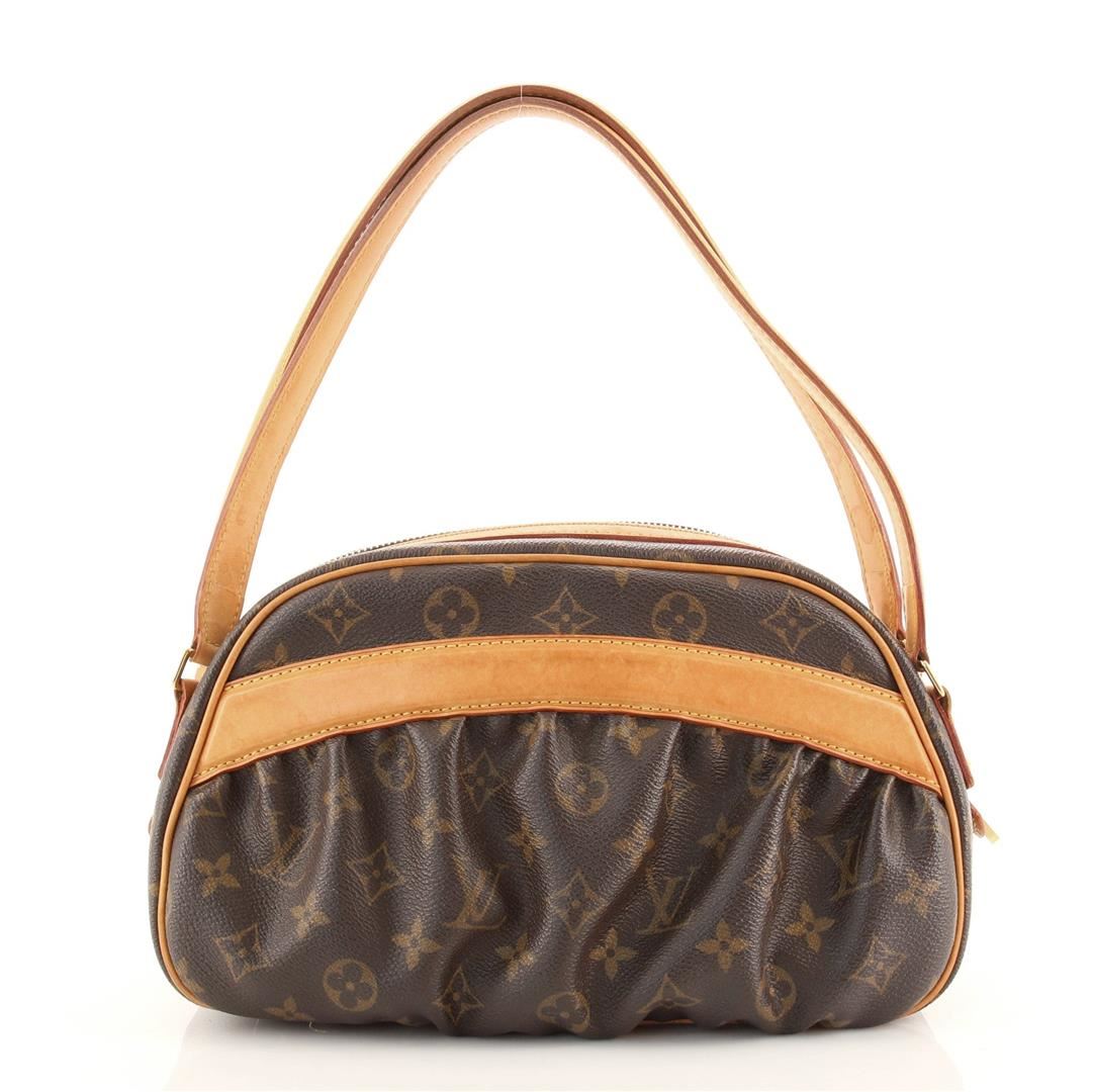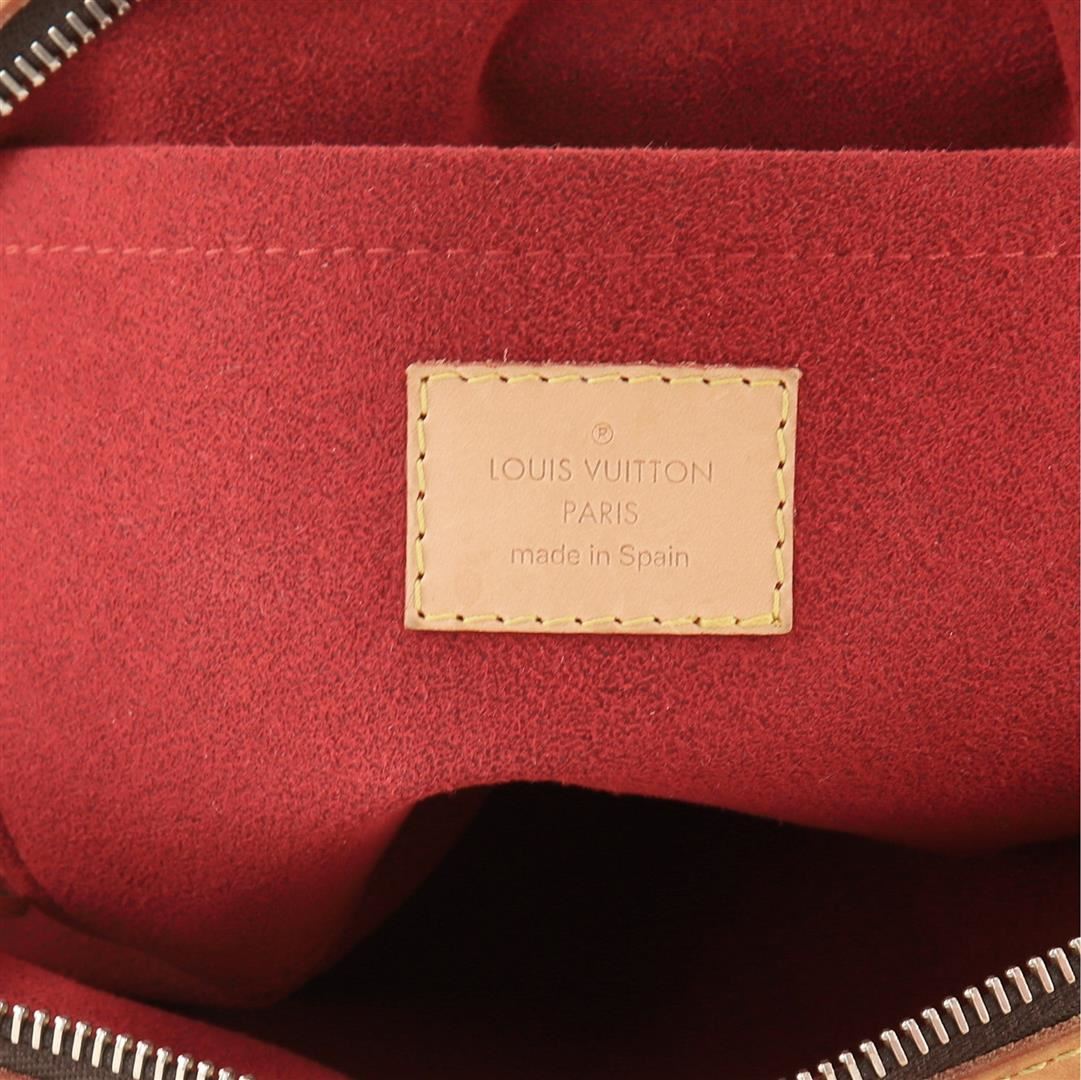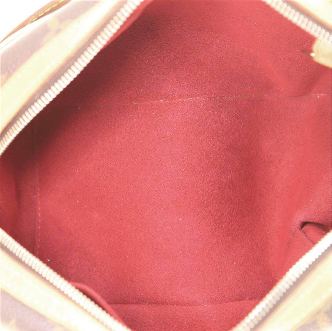 Brown and tan monogram coated canvas Louis Vuitton Klara bag with brass hardware, tan vachetta leather trim, dual flat shoulder straps, single exterior pocket at front, red Alcantara lining, single open pocket at interior wall and zip closure at top.