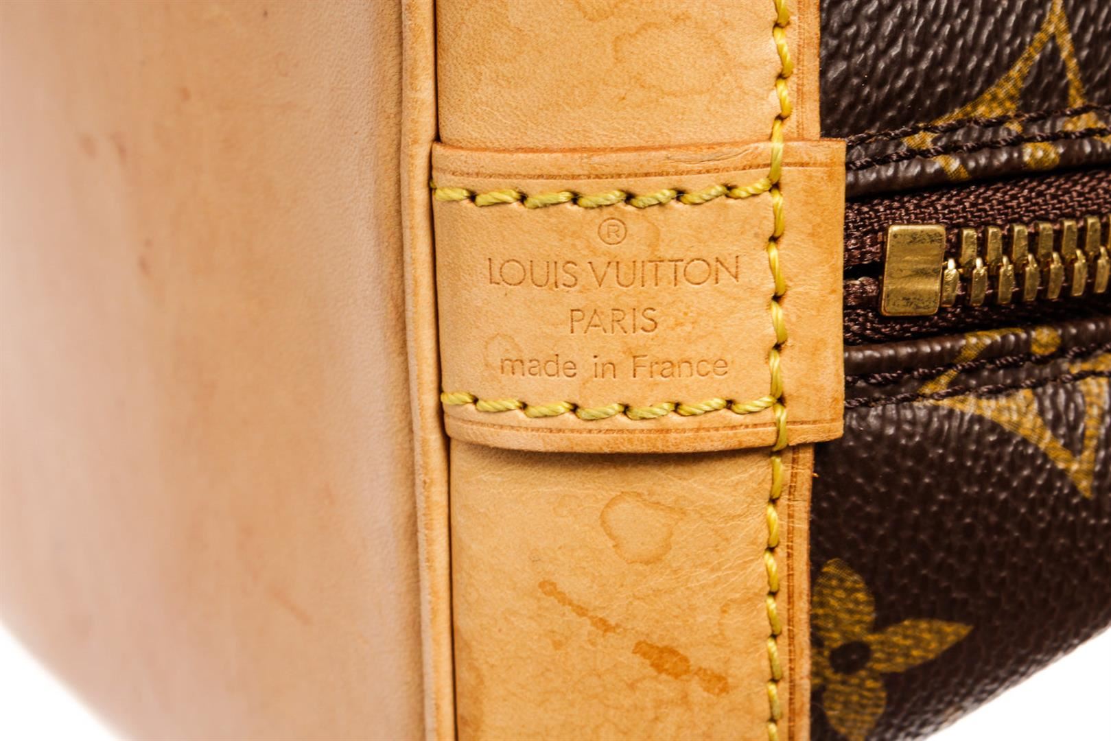 Brown and tan monogram coated canvas Louis Vuitton Alma PM with gold-tone hardware, tan vachetta leather trim, dual rolled top handles, brown canvas lining, single pocket at interior wall and zip closure at top. 2.5"x5.5"x9"xBag Drop:3"/cmx13.97cmx22