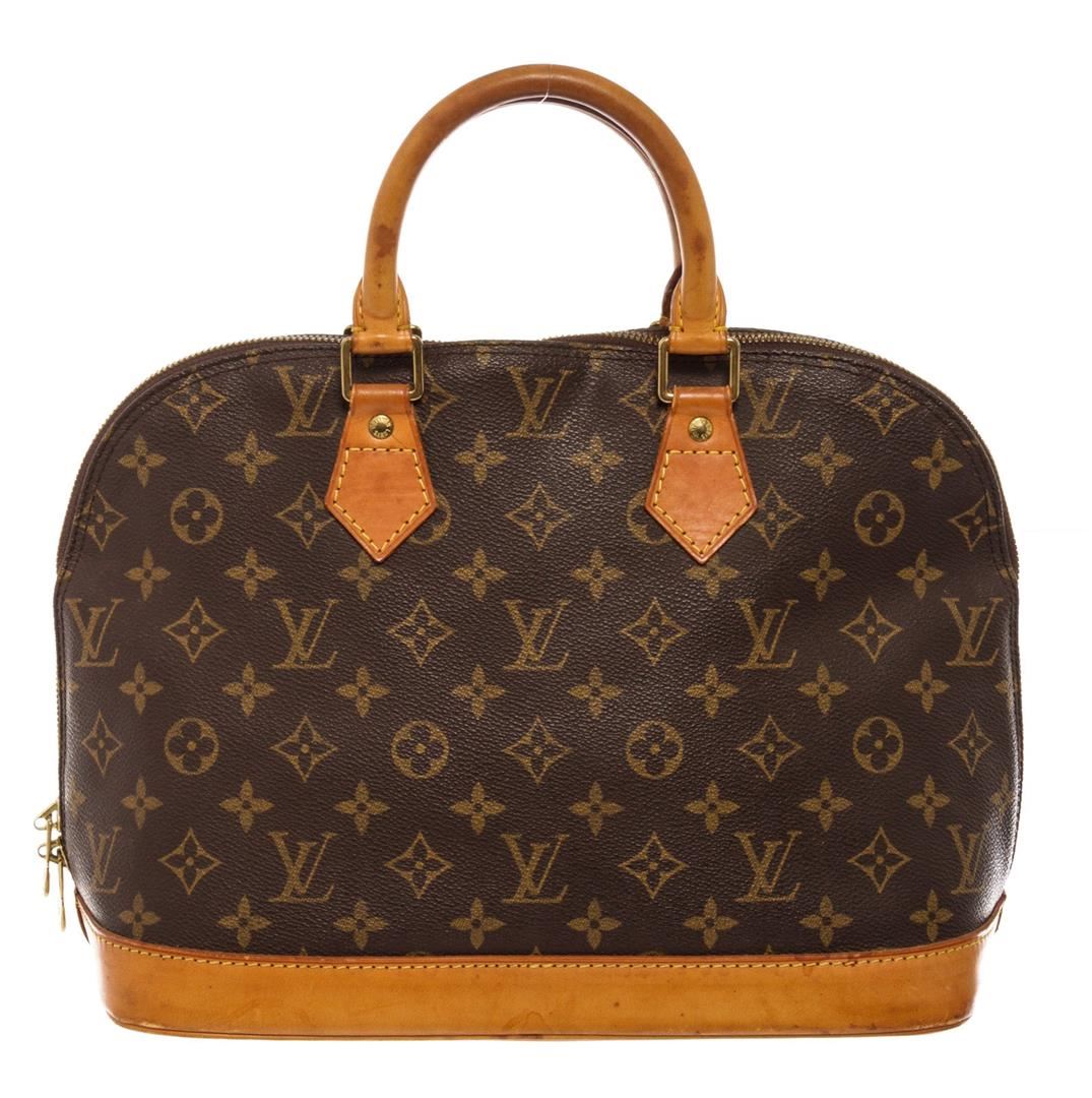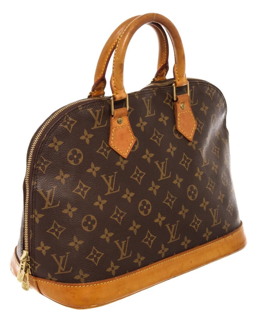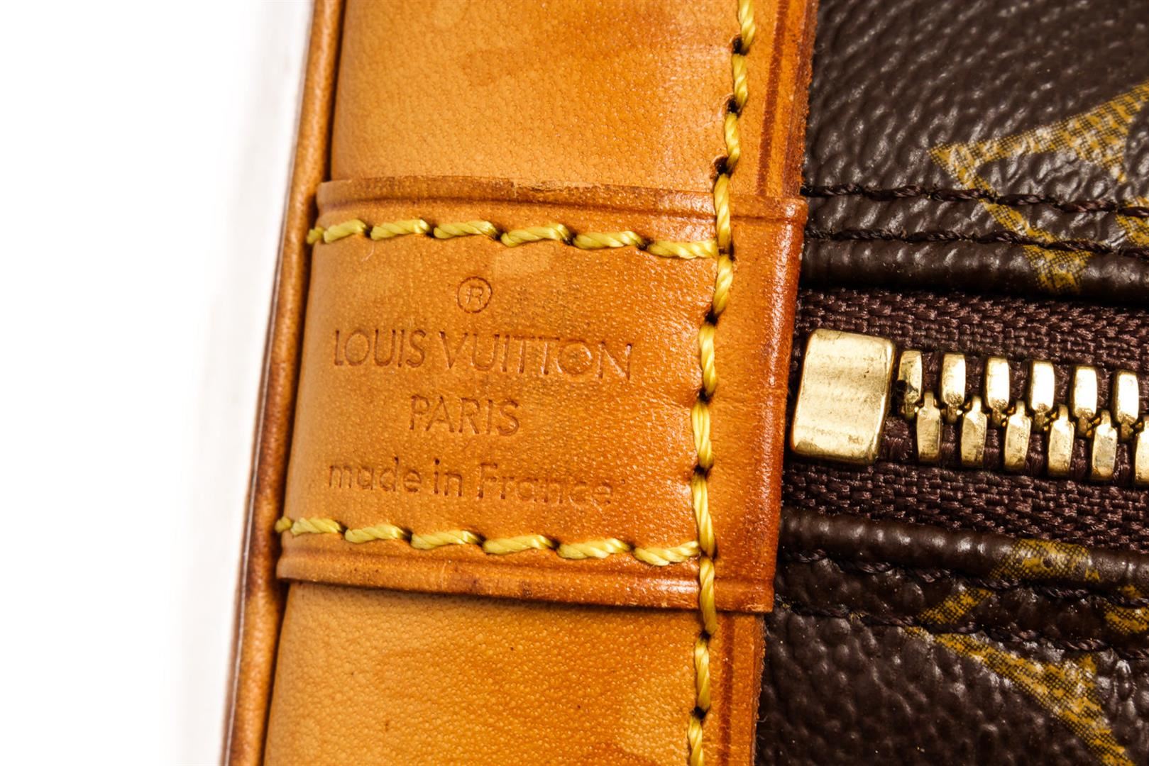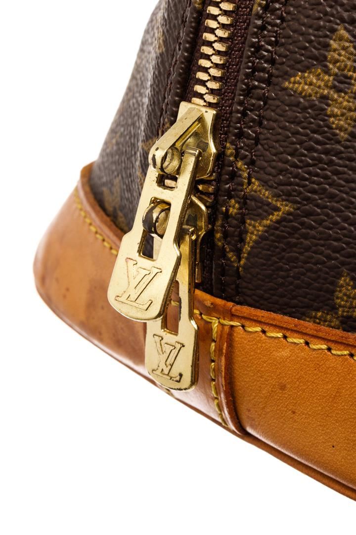 Brown and tan Monogram coated canvas Louis Vuitton Alma PM with gold-tone hardware, tan vachetta leather trim, dual rolled top handles, brown canvas lining, single pocket at interior wall and zip closure at top. 6.5"x5.5"x9"xBag Drop:3"/cmx13.9