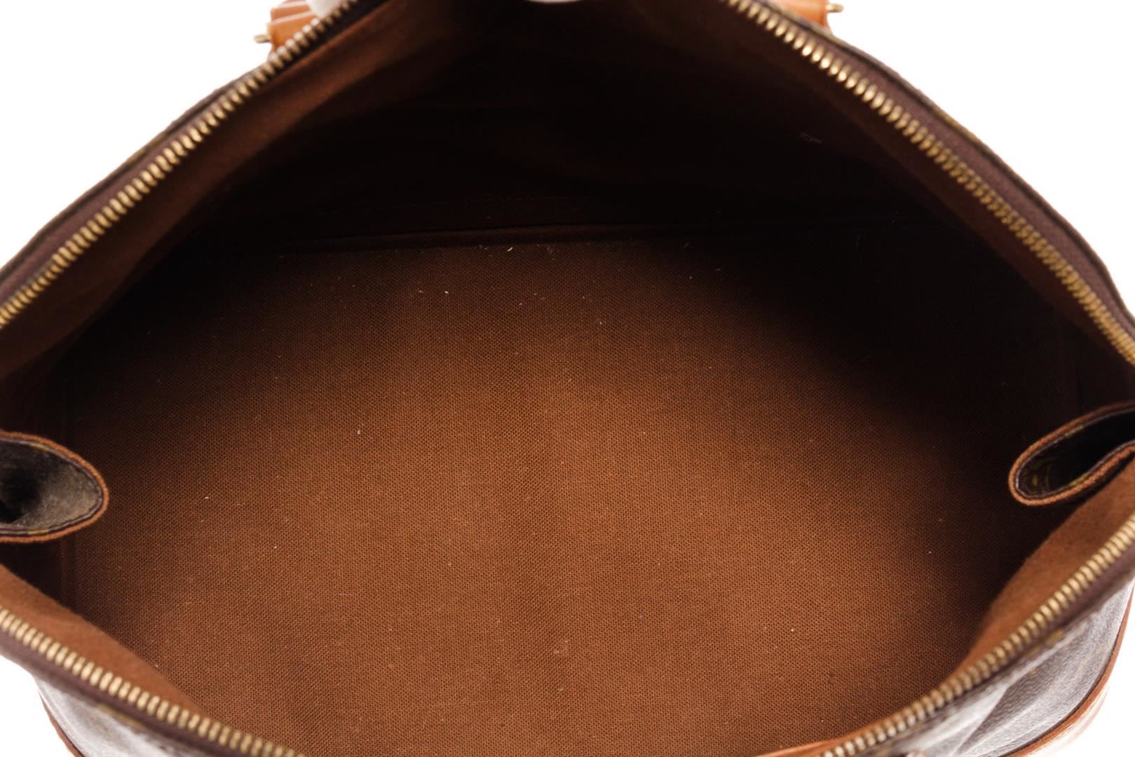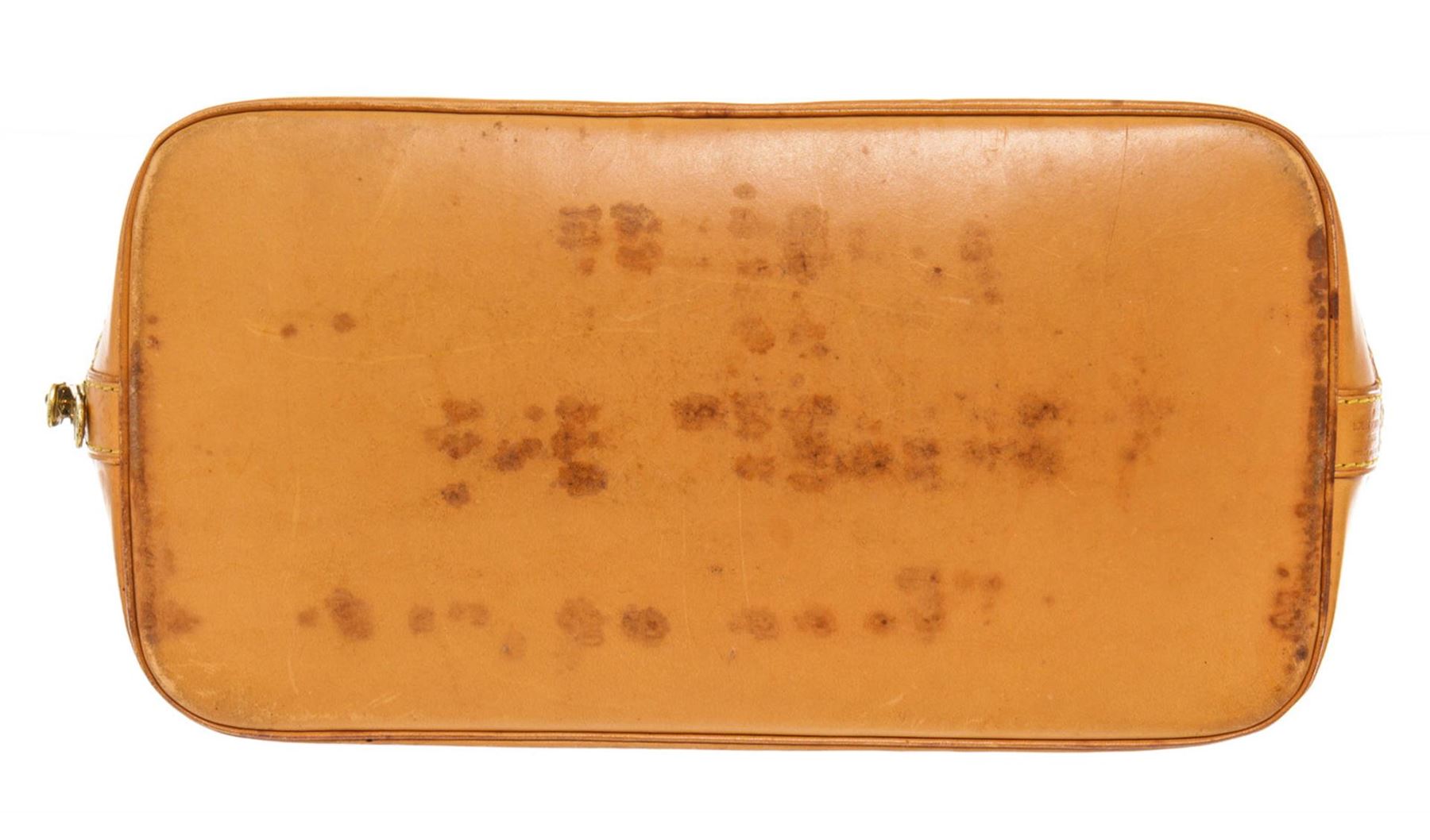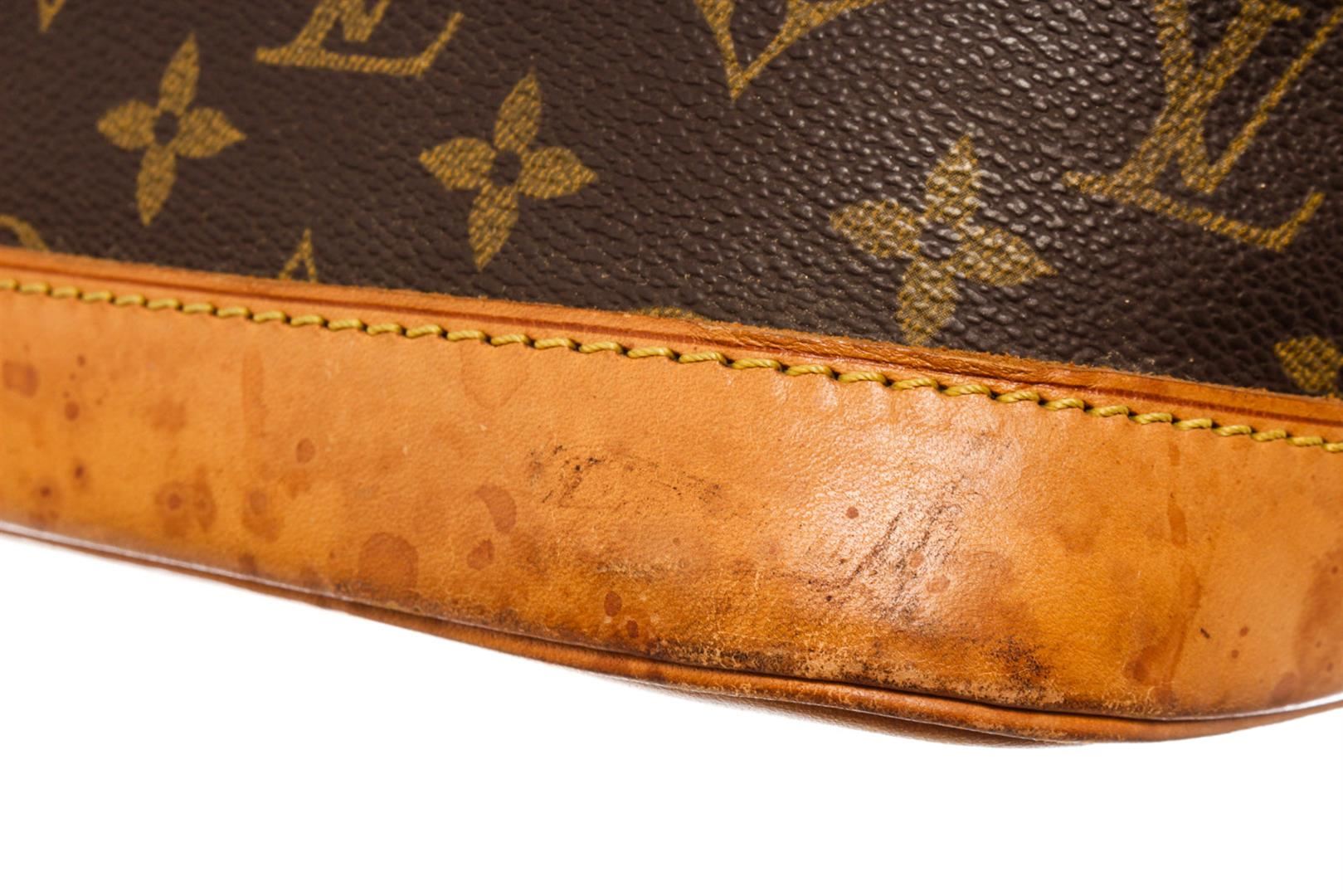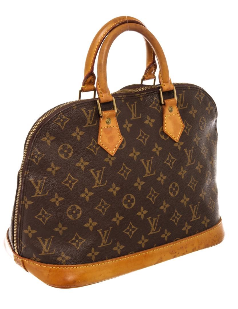 Brown and tan Monogram coated canvas Louis Vuitton Alma PM with gold-tone hardware, tan vachetta leather trim, dual rolled top handles, brown canvas lining, single pocket at interior wall and zip closure at top. 6.5"x5.5"x9"xBag Drop:3"/cmx13.9